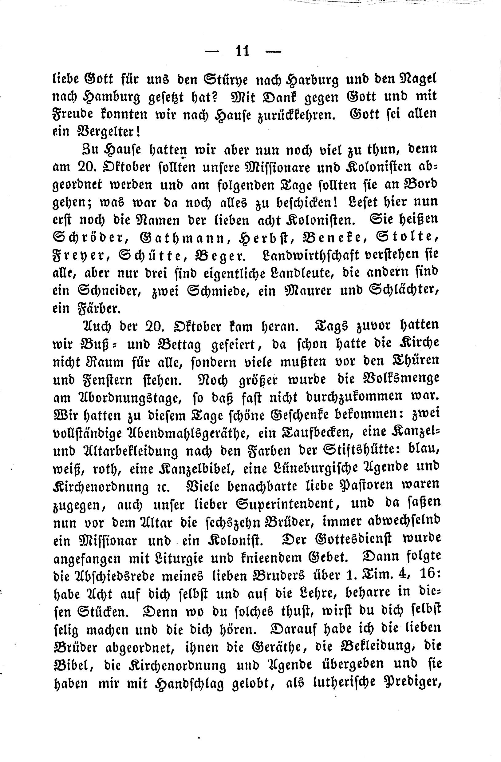Liebe Gott für uns den Stürye nach Harburg und den Nagel nach Hamburg gesetzt hat? Mit Dank gegen Gott und mit Freude konnten wir nach Hause zurückkehren. Gott sei allen ein Vergelterl Zu Hause hatten wir aber nun noch viel zu thun- denn am 20. Oktober sollten unsere Missionare und Kolonisten ab- geordnet werden und am folgenden Tage sollten sie an Bord gehen; was war da noch alles zu beschickenl Leset hier nun erst noch die Namen der lieben acht Kolonisten. Sie heißen Schröder, Gathmann, Herbst, Beneke, Stolte- FUVUU Schütte, Beger. Landwirthschast Verstehen sie alle, aber nur drei find eigentliche Landleute, die andern sind ein Schneider, zwei Schmiede, ein Maurer und Schlächteki ein Farben Auch der 20. Oktober kam heran. Tags zuvor hatten wir Buß- und Bettag gefeiert, da schon hatte die Kirche nicht Raum für alle, sondern viele mußten Vor den Thüren und Fenstern stehen. Noch größer wurde die Volksmenge am Abordnungstage, so daß fast nicht durchzukommen war. Wir hatten zu diesem Tage schöne Geschenke bekommen: zwei vollständige Abendmahlsgercithe, ein Taufbecken, eine Kanzel- und Altarbekleidung nach den Farben der Stistshütte: blau, weiß, roth, eine Kanzelbibel, eine Lüneburgische Agende und Kirchenordnung ic. Viele benachbarte liebe Pastoren waren zugegen, auch unser lieber Superintendent, und da saßen nun vor dem Altar die sechszehn Brüder, immer abwechselnd ein Missionar und-ein Kolonist. Der Gottesdienst wurde angefangen mit Liturgie und knieendem Gebet. Dann folgte die Abschiedsrede meines lieben Bruders über 1. Tim. 4- 16: habe Acht auf dich selbst und aus die Lehre, beharre in die- sen Stiicken. Denn wo du solches thust, wirst du dich selbst selig machen und die dich hören. Daraus habe ich die lieben Brüder abgeordnet, ihnen die Geräthe, die Bekleidung, die Bibel, die Kirchenordnung und Agende übergeben und sie haben mir mit Handschlag gelobt, als lutherische Prediger.