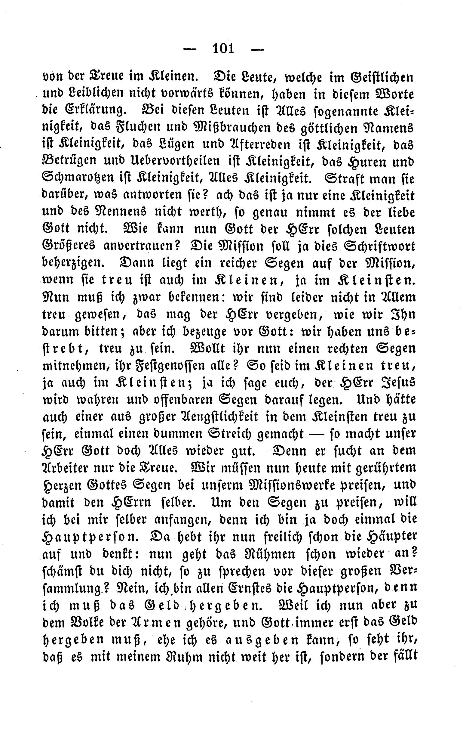 —10·1-— From loyalty in the small. The people who cannot move forward have in this word the explanation. With these people, everything called "small thing" – cursing and misusing the name of God is a small thing, lying and misusing the name of God is a small thing, betting and foretelling is a small thing, stealing and harming is a small thing. It is punishable when they answer. Ah, it's just a small thing, and the naming is not worth at all by God. How can God the Lord bestow greater blessings upon such people? The mission is to adhere to this scriptword. Then a rich blessing is on the mission if they are faithful in the smallest thing, yes in the smallest. Now I must confess: we are unfortunately not true to everything in this. God forgive us, as we beg Him; but I beseech Him: we have sought it, to be true. Let us take a right blessing with us, all my companions? So in the small, be true also in the smallest; yes, I say to you: Jesus Christ will be true and reveal a blessing upon it. And if one were to be truly faithful in the smallest thing, once a foolish trick – so our Lord God makes our own affairs better again. Because He seeks faithfulness in the worker. Now let us praise the God’s blessing at our mission work with our hearts, and that is for God himself. To praise the blessing, I begin with myself, because I am «yes, yes, once the main person. Now raise your heads and think: now it is a shame not to be shamefaced, so to speak before this great collection? No, I am truly the main person, I must give the money. Because I must belong to the people of the poor, and God first must give the money before I can spend it, so you see that it is not far away for my reputation, but it will fall