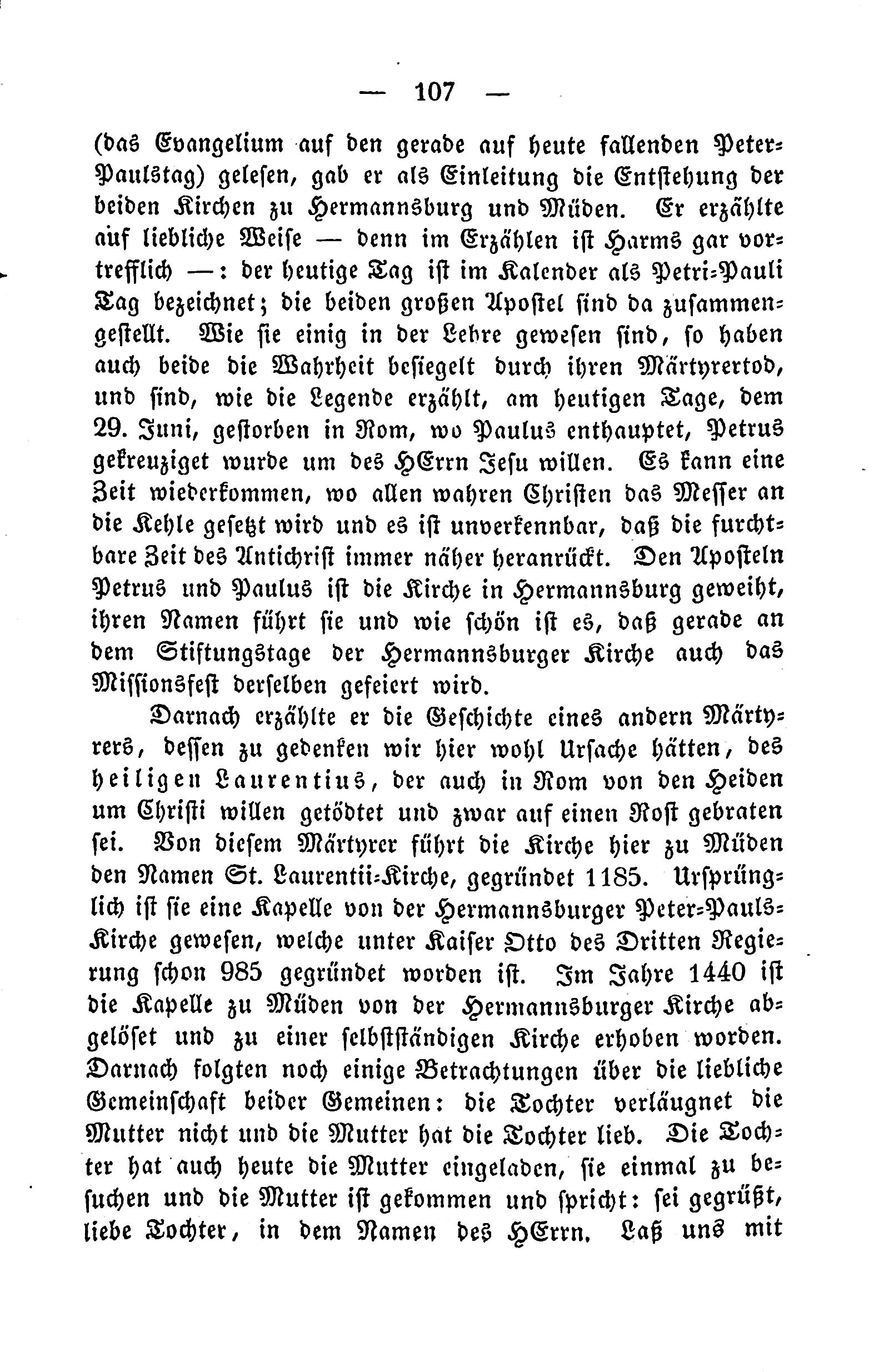 —107— The Gospel – an the recent day when Peter Pauli is departing – read, gave as an introduction the genesis of the two churches of Hermannsburg and Müden. He recounted lovingly – because telling is truly effective –: today is designated as the Petri Pauli day in the calendar; the two great apostles are together here. As they have agreed in the teaching, both also sealed the truth with their martyrdom, and are, as the legend tells it, today, on June 29th, in Rome, where Paul is enthralled, Peter crucified to honor the Lord Jesus. It can be a time when all true Christians will put a knife to their throat and it is unmistakable that the frightening time of Antichrist is always approaching closer. The church in Hermannsburg is dedicated to the apostles Peter and Paul, and their name leads them, and it is lovely that there is also a church foundation day for the Hermannsburg church celebrated. Darnach then recounted the story of another martyr, whose cause we should now consider here, the saintly Laurentius, who was also martyred in Rome by the Germans under the command of Christ, and was boiled on a sword. From this martyr, the church here leads to Müden the name St. Laurentii, founded in 1185. Initially, it was a chapel of the Hermannsburger Peter-Spanis- church, which was founded in 985 under the reign of Emperor Otto the Third. In years 1440, the chapel was dissolved by the Hermannsburger Church and elevated into an independent church. Darnach then made some further reflections on the amiable community of both churches: the daughter does not abandon the mother and the mother loves the daughter. The daughter now invites her to search for her and the mother comes and speaks: be greeted, dear daughter, in the name of God.