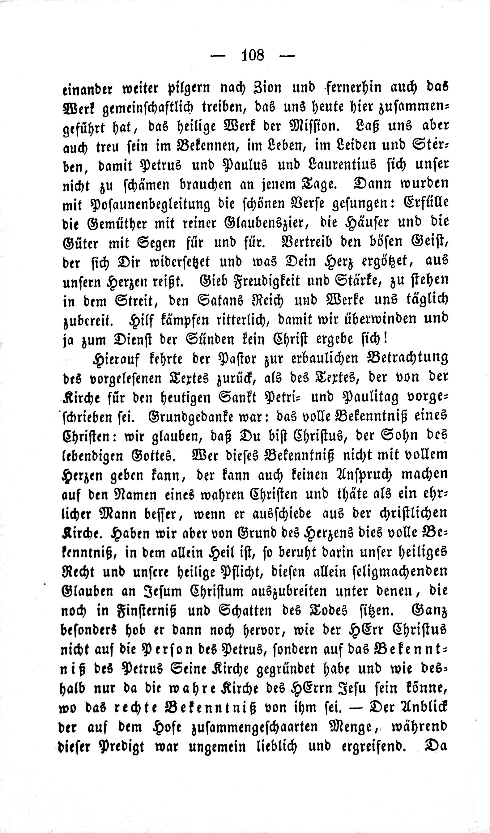 —108-— onward, continue to pilgrimage to Zion and further, also bring the work community together, which has united us today. Let us also be faithful in confession, in life, in suffering, and in death, so that Saint Peter, Paul, and Augustine may not be ashamed of them on that day. Then, with a procession of bells, beautiful verses were sung: Fill the hearts with pure faith, with houses and goods with blessings for, and for. Drive out the evil spirit that opposes you and what you desire, from our hearts. Give joy and strength to stand in the dispute of Satan’s reign and the works prepared for you. Help fight bravely, so that we can overcome and no longer yield to the service of sins to a Christian. Here, the pastor returned to the wholesome contemplation of the previous text, as the text that came from the church for today's Saint Peter and Paul. The principle was: the full confession of a Christian: we believe that you are Christ, the son of the living God. Anyone who cannot give this confession with a full heart can not claim the name of a true Christian and better be as a sincere man, if he departs from the Christian church. However, have we from the heart, in this alone, this full confession, that it is the sole right of our holy right and our holy duty, to spread this alone and holy faith in Christ under those who are still in darkness and shadow of death. Then, he then highlighted, how Christ does not put on Peter, but on the confession of Peter, and how it is half that only the true church of Christ is his. —- The sight of the congregation assembled on the grounds was extraordinarily lovely and magnificent.