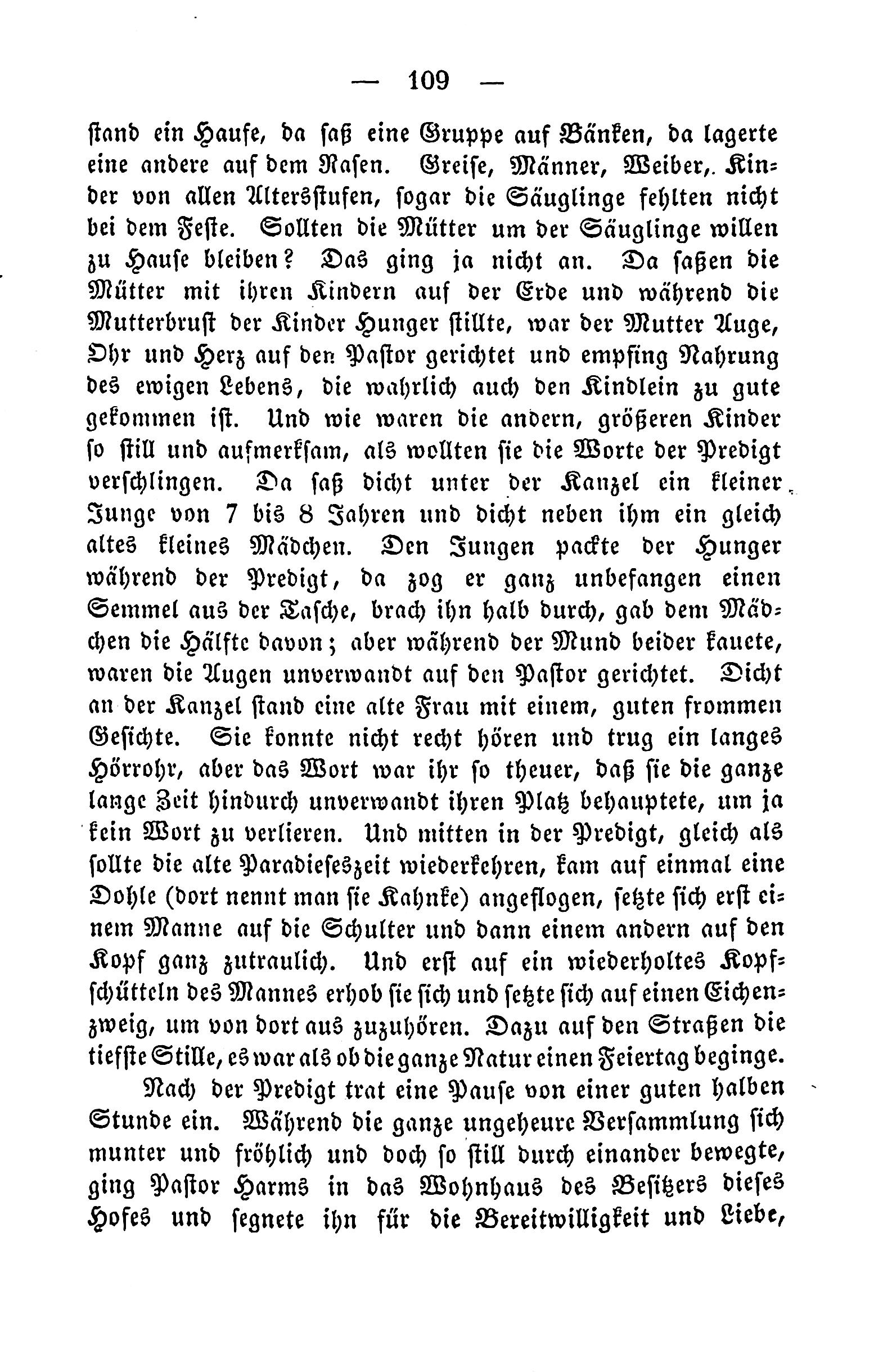 stand ein hallux a fondo stand eine Gruppe aus Tischen stand ein Mann und eine Frau, Kinder und Kinder von allen Altersstube, sogar die Säuglinge fehlten nicht bei dem Fest. Sollten die Mütter um der Säuglinge willen zu Hause bleiben? Das ging ja nicht an. Die Mütter saßen mit ihren Kindern aus der Erde, während die Mutterbrust der Kinder stillte, war der Mutter Auge, Ohr und Herz auf den Pastor gerichtet und empfing Nahrung des ewigen Lebens, die wahrlich auch den Kindlein zu gute gekommen ist. Und wie waren die anderen, größeren Kinder so still und aufmerksam, als wollten sie die Worte der Predigt verschlingen. Da saß dicht unter »der Kanzel ein kleiner Junge von 7 bis 8 Jahren und gleich altes kleines Mädchen. Den Jungen packte der Hunger während der Predigt, da zog er ganz unbefangen einen Sennel aus der Tasche, brach ihn halb durch, gab dem Mäd- chen die Hälfte davonz aber während der Mund beider kauete, waren die Augen unverwandt auf den Pastor gerichtet. Dicht an der Kanzel stand eine alte Frau mit einem guten frommen Gesicht. Sie konnte nicht recht hören und trug ein langes Hörro)r, aber das Wort war ihr so teuer, daß sie die ganze lange Zeit hindurch unverwandt ihren Platz behauptete, um ja vkein Wort zu Verlieren. Und mitten in der Predigt, gleich als sollte die alte Paradieseszeit wiederkehren, kam auf einmal eine Dohle (dort nennt man sie Kahnke) angeflogen, setzte sich erst einem Manne auf die Schulter und dann einem anderen auf den Kopf ganz zutraulich. Und erst aus wiederholtem Kopf- schiitteln des Mannes erhob sie sich und setzte sich auf einen Eichen- zweig, um Von dort aus zuzuhören. Dazu auf den Straßen die tiefste Stille, eswar als ob die ganze Natur einen Feiertag begänge. Nach der Predigkeit trat eine Pause von einer guten halben Stunde ein. Während die ganze ungeheure Versammlung sich munter und fröhlich und doch so still durch einander bewegte- ging Pastor Harms in das Wohnhaus des Besitzers dieses Hofes und segnete ihn für die Bereitwilligkeit und Liebe.