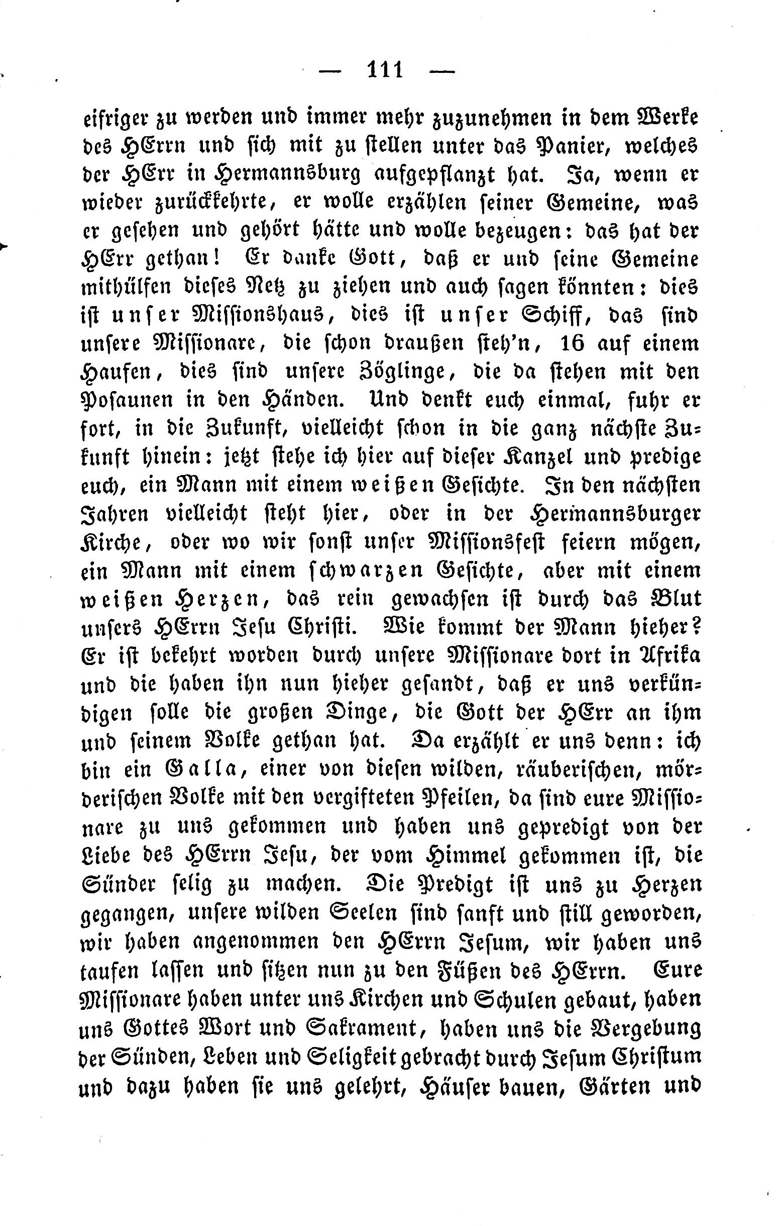 111 – and more and more to succumb to hunger. And if he returned again, he would tell his master what he had seen and heard, and would testify: that was the HERR’s work! He is grateful to God that he and his master have brought this network and also say that this is our mission house, this is our ship, which are our missionaries who are standing outside, 16 on a heap, which is our zöglings, who stand with the pipes in their hands. And think once, how far did he go into the future, perhaps already into the very next coming? Here I stand on this balcony, preaching to you, a man with a white face. In the next years, perhaps here, or in the new church of the Eucharist, or where we would otherwise celebrate our missions festival. A man with a black face, but with a white heart, which is growing through the blood of our Lord Jesus Christ. How does he come? He has been converted by our missionaries there in Africa, and they have sent him to us to carry him further, to deliver him from the great things that God has done to him and his people. Therefore, we tell you: I am a Galla, one of these wild, savage, murderous people with poisoned arrows, and your missionaries have come to us to preach from the love of Jesus Christ, who came from heaven to save us all. The sermon has gone into our hearts, and our gentle souls have become calm and still. We have accepted the Lord Jesus, we have been baptized, and we sit at the feet of the Lord. Your missionaries have built churches and schools under us, have given us the word and sacraments, have brought forgiveness of sins, life and salvation through Jesus Christ, and that is why they have taught us to build houses, gardens, etc.