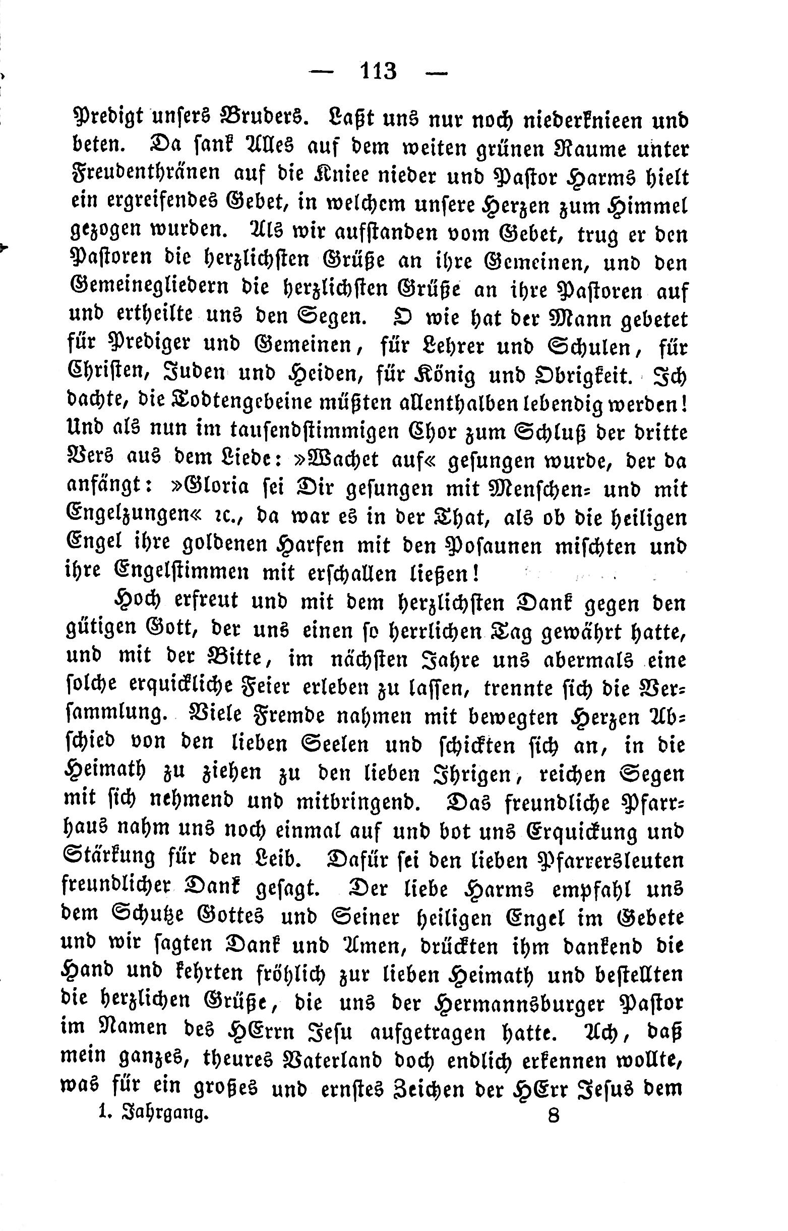 113 - Predigt users Brüder. Let us only kneel and pray. Because everything is falling down on the wide green space under joyful signs, Pastor Harms held a moving prayer, in which our hearts were drawn to heaven. When we rose from the prayer, he carried the warmest greetings to their congregations, and the congregations warmest greetings to their pastors and he granted us the blessing. Oh, how has the man prayed for preachers and the damned? For teachers and schools, for Christians, Jews, and pagans? He thought the dead would all become alive! And as now, in a thousand-voiced chorus at the end of the third verse of the hymn: ))Wachet aus…