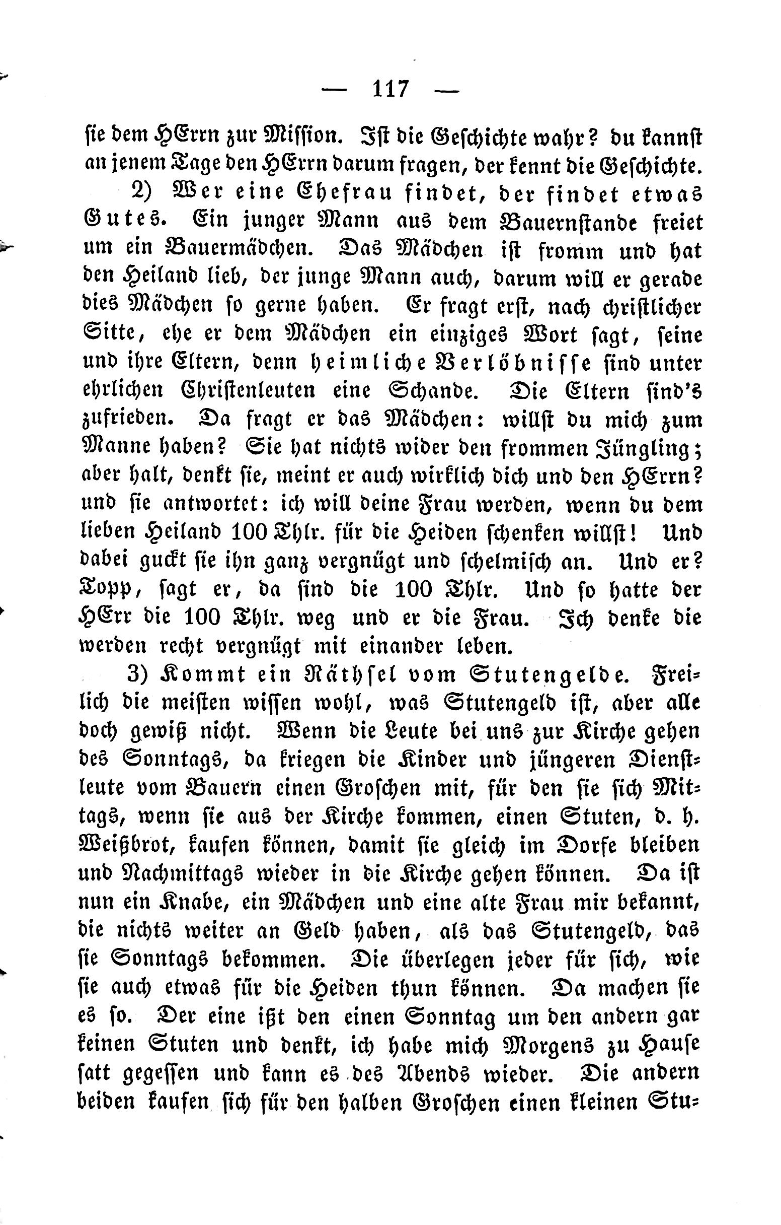 Sie dem Herrn zur Mission. Jest die Geschichte wahr? Du kannst an dem Herrn fragen, der die Geschichte kennt. L) Wer eine Ehefrau findet, findet etwas Gutes. Ein junger Mann aus dem Bauernstand freiet um ein Bauermädchen. Das Mädchen ist fromm und hat den Heiland lieb, der junge Mann auch, darum will er gerade dies Mädchen so gerne haben. Er fragt erst, nach christlicher Sitte, ehe er dem Mädchen ein einziges Wort sagt, seine und ihre Eltern, denn heimlich e Ver löbnisfe sind unter ehrlichen Christenleuten eine Schande. Die Eltern sind’s zufrieden. Da fragt er das Mädchen: willst du mich zum Manne haben? Sie hat nichts wider den frommen Jiinglingz aber halt, denkt sie, meint er auch wirklich dich und den Herrn? und sie antwortet: ich will deine Frau werden, wenn du dem lieben Heiland 100 Thit. für die Heiden schenken willst! Und dabei guckt sie ihn ganz vergnügt und schelmisch an. Und er? Top, sagt er, da sind die 100 Thlr. Und so hatte der Herr die 100 Thit. weg und er die Frau. Ich denke die werden recht Vergnügt mit einander leben. 3) Kommt ein Räthsel Vom Stutengelde. Frei- lich die meisten wissen wohl, was Stutengeld ist, aber alle doch gewiß nicht