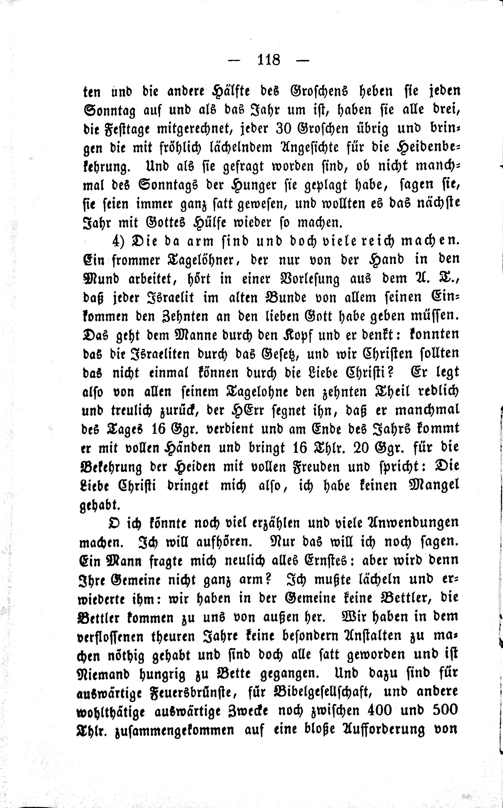 —118— Ten and the other half of the Groschens are raising them on Sundays, and as the year passes, they each have three of the five, the festivals counted, each having 30 marks remaining and bringing them with cheerful smiles for the Heiden blessing. And when they are asked whether not every Sunday sometimes causes hunger for them, they say they are always quite full, and wanted to make it again the next year with the help of God. 4) The poor and yet many rich. A rural day laborer, who only works by hand into his mouth, hears a lecture from the A.T., that every Israelite in the ancient book must give his tenth of all his earnings to God. It goes through his head, and he thinks: could the Israelites through the law, and we Christians, not even be able to do this through the love of Christ? He then puts all his day labor back to God with honest and faithful diligence, may God have mercy on him that he may earn 16 Ggr. sometimes and at the end of the year come with full hands and bring 16 Thlr. 20 Ggr. for the Heiden blessing, and speaks: The love of Christ moves me, I have no lack. I could tell you much more. And many applications I would like to stop. Only this I want to say. A man asked me recently all serious: but will your dear not quite poor? I had to smile and he repeated: we have no beggars outside us. We have not had special places for us in that past year, and yet we are all satisfied and is nobody hungry to bed. And to that, we are also gathering out from outside fires, for the Bible society, and other charitable out-of-town purposes, for 400 to 500 Ggr. together in a simple request from -..-