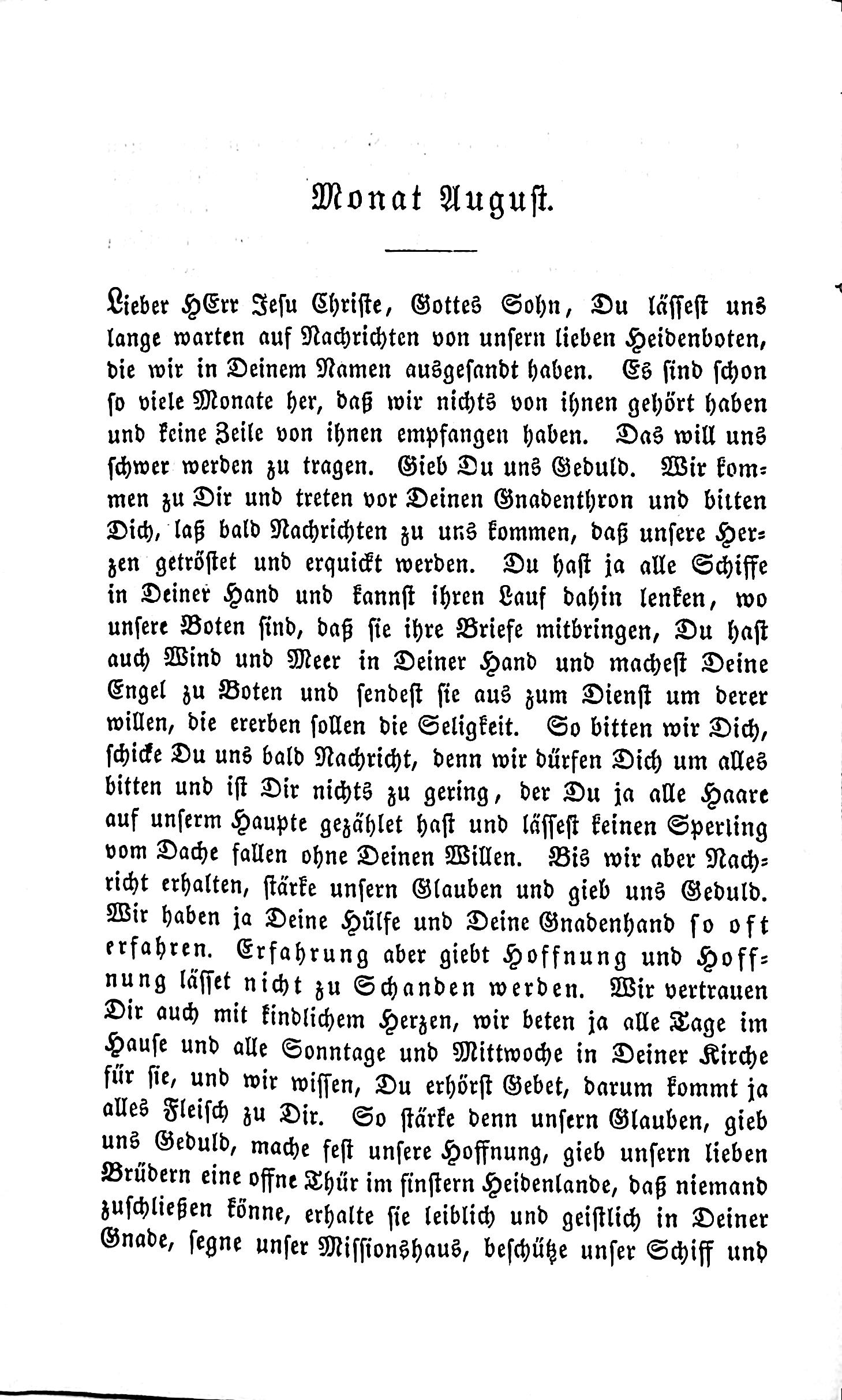 Monat August. Lieber Herr Jesu Christe, Gottes Sohn, Du lässt uns lange warten auf Nachrichten von unseren lieben Heidenboten, die wir in Deinem Namen ausgesandt haben. Es sind schon so viele Monate her, dass wir nichts von ihnen gehört haben und keine Zeile Von ihnen empfangen haben. Das will uns schwer werden zu tragen. Gieb Du uns Geduld. Wir kom-men zu Dir und treten vor Deinen Gnadenthron und bitten Dichxlaß bald Nachrichten zu uns kommen, daß unsere Her- zen getröstet und erquickt werden. Du hast ja alle Schiffe in Deiner Hand und kannst ihren Laus dahin lenken, wo unsere Boten sind, daß sie ihre Briefe mitbringen, Du hast auch Wind und Meer in Deiner Hand und machest Deine Engel zu Boten und sendest sie aus zum Dienst um derer willen, die ererben sollen die Seligkeit. So bitten wir Dich, schicke Du uns bald Nachricht, denn wir dürfen Dich um alles bitten und ist Dir nichts zu gering, der Du ja alle Haare auf unserm Haupte gezähelt hast und lässest keinen Sperling VVM Dache fallen ohne Deinen Willen. Bis wir aber Nach- richt erhellt-m starke unsern Glauben und Gieb uns Geduld. Wir haben ja Deine Hülfe und Deine Gnadenhand so oft Erfahrest Erfahrung aber giebt Hoffnung und Hoff- ang lä«ssek Nicht zu Schanden werden. Wir Vertrauen Dir auch mit kindlichem Herzen, wir beten ja alle Tage im Hause und alle Sonntage und Mittw Woche in Deiner Kirche ka fik- Und wir wissen, Du erhörst Gebet, darum kommt ja Alles Fleisch zu Dir. So stärke denn unsern Glauben, gieb Uns.
