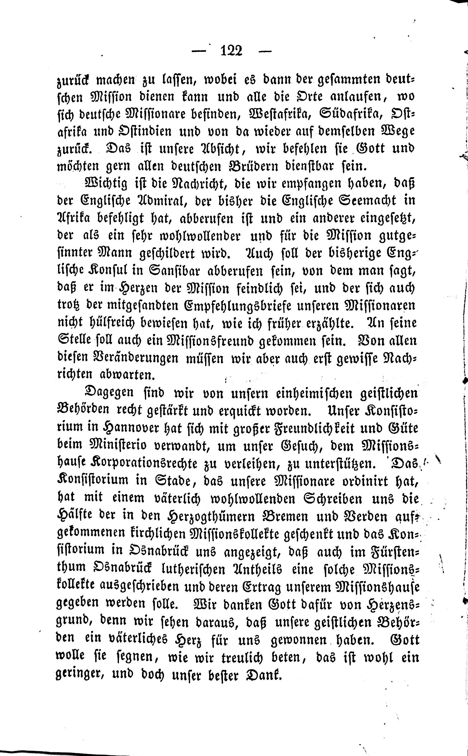 122 —- to allow them back, whereby it may serve as the entirety of the mission’s documents and all the places where German missionaries are located in West Africa, South Africa, East Africa, and Southeast Asia, and then return on the same path from there. This is our intention, we command them to God and would like to be among the brothers of the mission as a friend. It is important that the English Admiral, who previously commanded the English Navy in Africa, has been replaced and a different man is being assigned as a very benevolent and well-meaning man. Furthermore, the previous English Consul in Sansibar must also be dismissed, as it is said that he is hostile to the mission, and despite the instructions sent to us, he has not been cowardly. I told you earlier how I had previously told this. In a fine place, a mission friend must have come. With all these changes, we must also wait for certain instructions. We have been firmly restrained by our local spiritual authorities, and have been compelled by our Consul in Hanover. Our headquarters in Hanover is in good faith and kindness with the Ministerio, to support our mission’s corporate rights. ·!« X Consistory in Stade, which has issued a paternal kindly letter to us, saying that half of the church collections brought to us by the Herzogthümmers and Verden in the Theological Commission have been given and that the system of the consistory in Osnabrück has been shown us that even in the Fürstthum Osnabrück, a similar collection of church hymns has been issued and their profit should be given to our mission house. We thank God for our heart, because we see from this that our spiritual authorities have won us with a fatherly heart. God bless them, as we faithfully pray, this is a small but our best blessing.