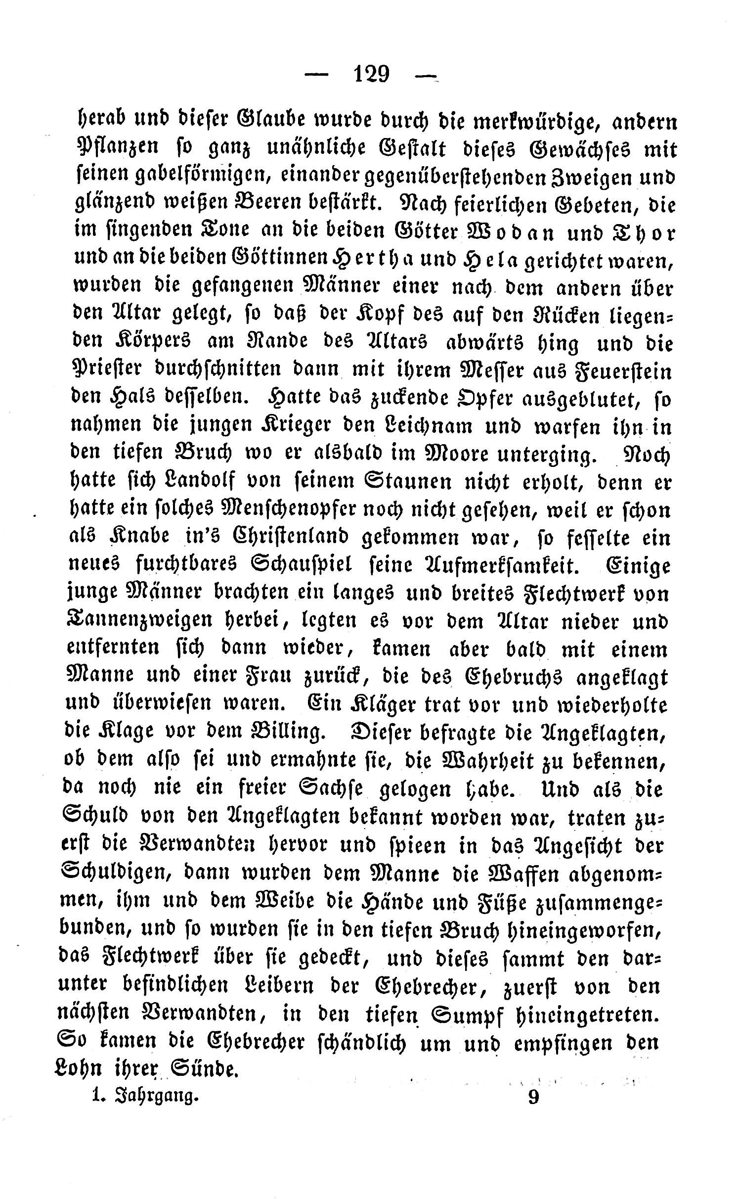 — 129 —, herab und dieser Glaube wurde durch die merkwürdige, andern Pflanzen so ganz unähnliche Gestalt dieses Gewächses mit feinen gabelförmigen, einander gegenüberstehenden Zweigen und glänzend weißen Beeren bestärkt. Nach feierlichen Gebeten, die im singenden Tone an die beiden Götter Wo d an und Th or und an die beiden GöttinnenHerth a und H ela gerichtet waren, wurden die gefangenen Männer einer nach« dem andern über den Altar gelegt, so daß der Kopf des auf den Rücken liegen- den Körpers am Rande des Altars abwärts hing und die Priester durchschnitten dann mit ihrem Messer aus Feuerstein den Hals desselben. Hatte das zuckende Opfer ausgeblioniert, so nahm die jungen Krieger den Leichnam und warfen ihn in den tiefen Bruch wo er alsbald im Moore unterging. Noch hatte sich Landolf Von seinem Staunen nicht erholt, denn er hatte ein solches Menschenopfer noch nicht gesehen, weil er schon als Knabe in’s Christenland gekommen war, so fesselte ein neues furchtbares Schauspiel seine Aufmerksamkeit Einige junge Männer brachten ein langes und breites Flechtwerk von Tannenzweigen herbei, legten es vor dem Altar nieder und entfernten sich dann wieder, kamen aber bald mit einem Manne und einer Frau zurück, die des Ehebruchs angeklagt und überwiesen waren. Ein Kläger trat vor und wiederholte die Klage vor dem Billing. Dieser befragte die Angeklagten, ob dem also sei und ermahnte sie, die Wahrheit zu bekennen, da noch nie ein freier Sachse gelogen habe. Und als die Schuld von den Angeklagten bekannt worden war, traten zu- erst die Verwandten hervor und spieen in das Angesicht der Schuldigen, dann wurden dem Manne die Waffen abgenom- men, ihm und dem Weibe die Hände und Füße zusammenge- bunden, und so wurden sie in den tiefen Bruch hineingeworfen, das Flechtwerk über sie gedeckt, und dieses sammt den dar- unter befindlichen Leibern der Ehebrecher, zuerst von den nächsten Verwandten, in den tiefen Sumpf hineingetreten. So kamen die Ehebrecher schändlich um und empfingen den Lohn ihrervSünde · » , « 1. Jahrgang. 9