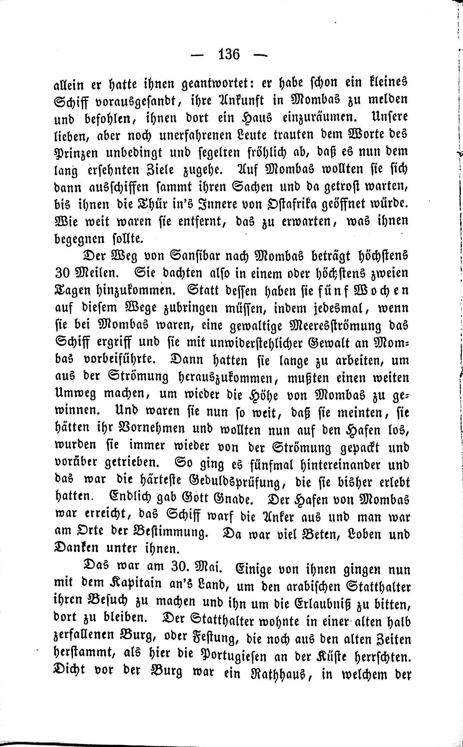 136 allein he had responded to them: He had already sent a small ship to report their arrival and ordered them to arrange a house there. Our dear, but still unworldly, people believed the prince’s word, and they sailed happily away, that it would now reach their long-desired goal. On Mombas, they intended to sail out, with their belongings and, until relieved, waiting for the opening of the doors into their interior of Africa. How far had they traveled, to anticipate what they might encounter? · · The route from Zanzibar to Mombas is at most 30 miles. They thought they would arrive in a day or two, instead having to spend a week on this journey, every time they were in Mombas, a tremendous wave of the ship seized them, and forcefully carried them away with irresistible force towards Mom-bas. Then, they worked long to escape the wave, had to make a wide detour to return to the height of Mombas, and were then victorious. And now they were so far, that they intended to say they had reached their claim and wanted to leave the harbor, but they were repeatedly swept by the current and pushed back. So it went five times in a row, and that was the folly. God gave them grace. The ship threw anchor, and there was a great sense of calm. It was a great destination. Some went to the Capcook MS land to wait for the Arab Governor’s visit and ask for permission to stay. The Governor lived in an old, half-ruined castle – a fortress, which still ruled over the Portuguese as the remnants of the old times. In fact, before the war, there was a hall, in which …
