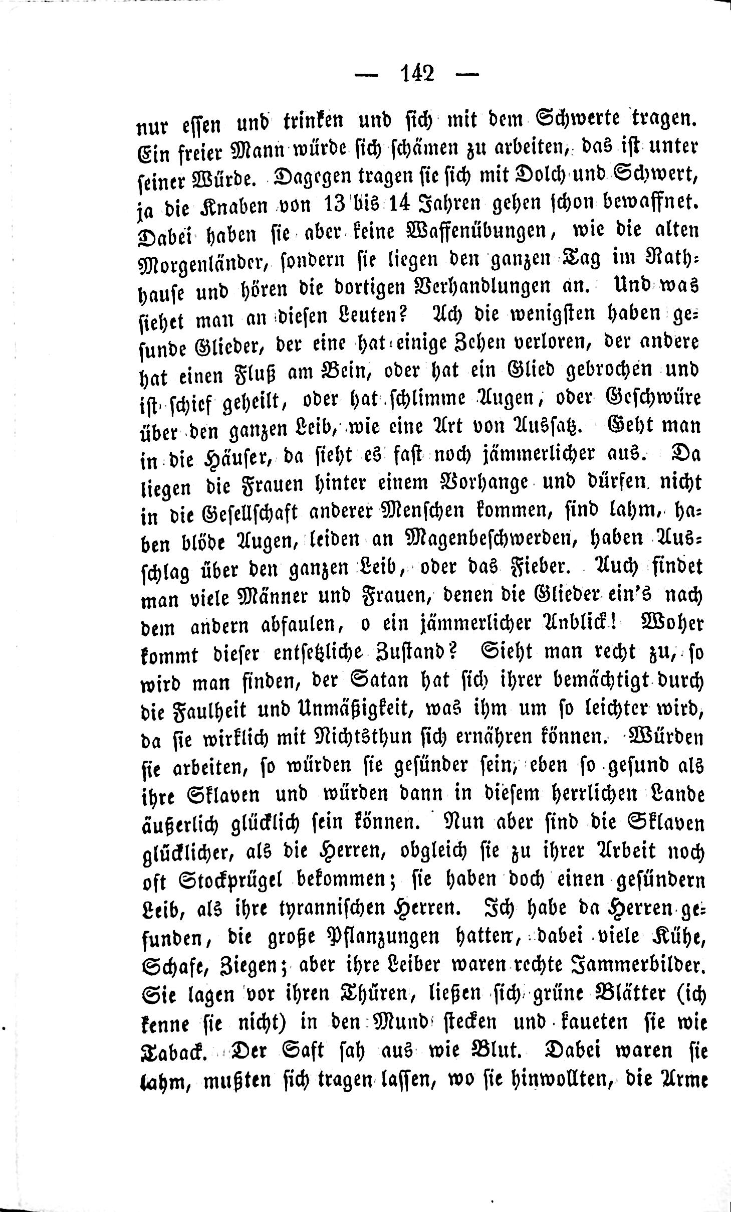 Translate from German to English: —142—— only eat and drink and wear a yoke. A free man-would be ashamed to work; that is under his dignity. Against this, they wear a yoke and sword, yes, the boys of 13 years already armed. When they do this, they have but weapons, unlike the old mornings. They remain in the middle of the day, in the house, and listening to the negotiations there. And what you see when you look at these people. 2. Ach, the least have given- a severed hand, one has a river on the leg, the other has a branch broken and has a fracture and it’s healed, or has a grotesque eye. Or, a kind of rash covering the whole body. You see that houses are filled with people, you see it almost still more pathetic. Because the women behind a door and are not allowed to come into the company of other people, are weak-« those are stupid- they have bad eyes, they suffer from stomach ailments, have »splashes over the whole body,«. like a kind of sort of rash. You see that houses are filled with men and women – they are almost equal in their bodies. A rather pathetic sight! Where does this terrible state come from? You see that they have dominated the Satan, through the laziness and lack of moderation, which makes them easier to do nothing. Would they work, so they would be stronger, just as their slaves are healthy, and then in this wonderful country, they would be perfectly happy. Now, but the slaves are happier than the lords, although they often get a stock price for their work. But they have a healthy body, as compared to their tyrannical lords. I have men and women here, who keep large planting, many cows, sheep; but their bodies were right pictures. They remained in the middle of their doors, let leaves (I don’t know them) in their mouths and ate them like straw. The juice looked like blood. And when they were like that, they were weak, they had to be carried along where they wanted, their arms.