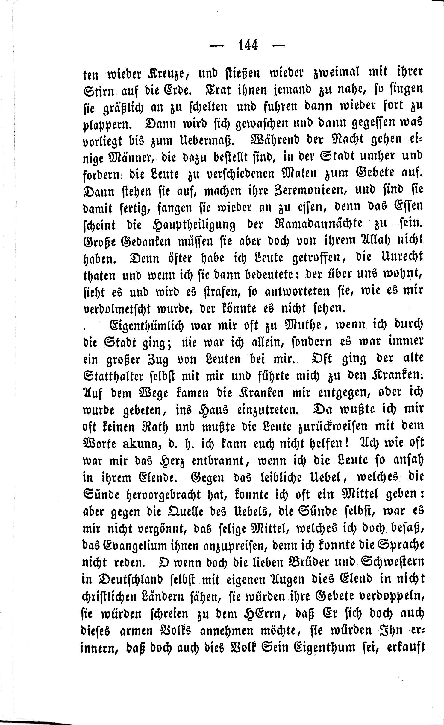 —144- ten times again cross, and meet twice with their nose on the earth. Someone to the side shouted, bitterly sang, and then continued to plop. Then, it will be washed and eaten what lies there until the extreme. During the night, some men, ordered to go around the city and demand prayers from people to different paintings. Then they stand up, make their ceremony, and find it finished, then begin to eat again because the food seems to be the main holy place of Ramadan. However, they still do not have thoughts of Allah in them. I have met many people who commit evil, and if I said it, the one who dwells above sees it and punishes it, they answered, as it was translated to me: whoever could not see it. Character was often too cruel to walk through the city; never was I alone, but there was always a great crowd of people. Often the old steward himself walked with me and led me to the sick. On the way, the sick came to me, or I was asked to enter the house. I often did not know the mayor and had to send people back with the word akuna, which is "I cannot help you!" How many times my heart burned when I saw the people in their misery. Against the physical affliction that the sin has produced, I often had a means to give: but against the source of the sin, the sin itself, was not permitted to praise it, for I could not speak the blessed means which I possessed, the Evangelium. If, yes, the dear brothers and sisters in Germany saw this misery in not Christian countries, they would double their prayers, they would cry to the Lord, that He should accept this poor people. They would invite him in, that indeed, this. Volk Becomes the ownership of the people.