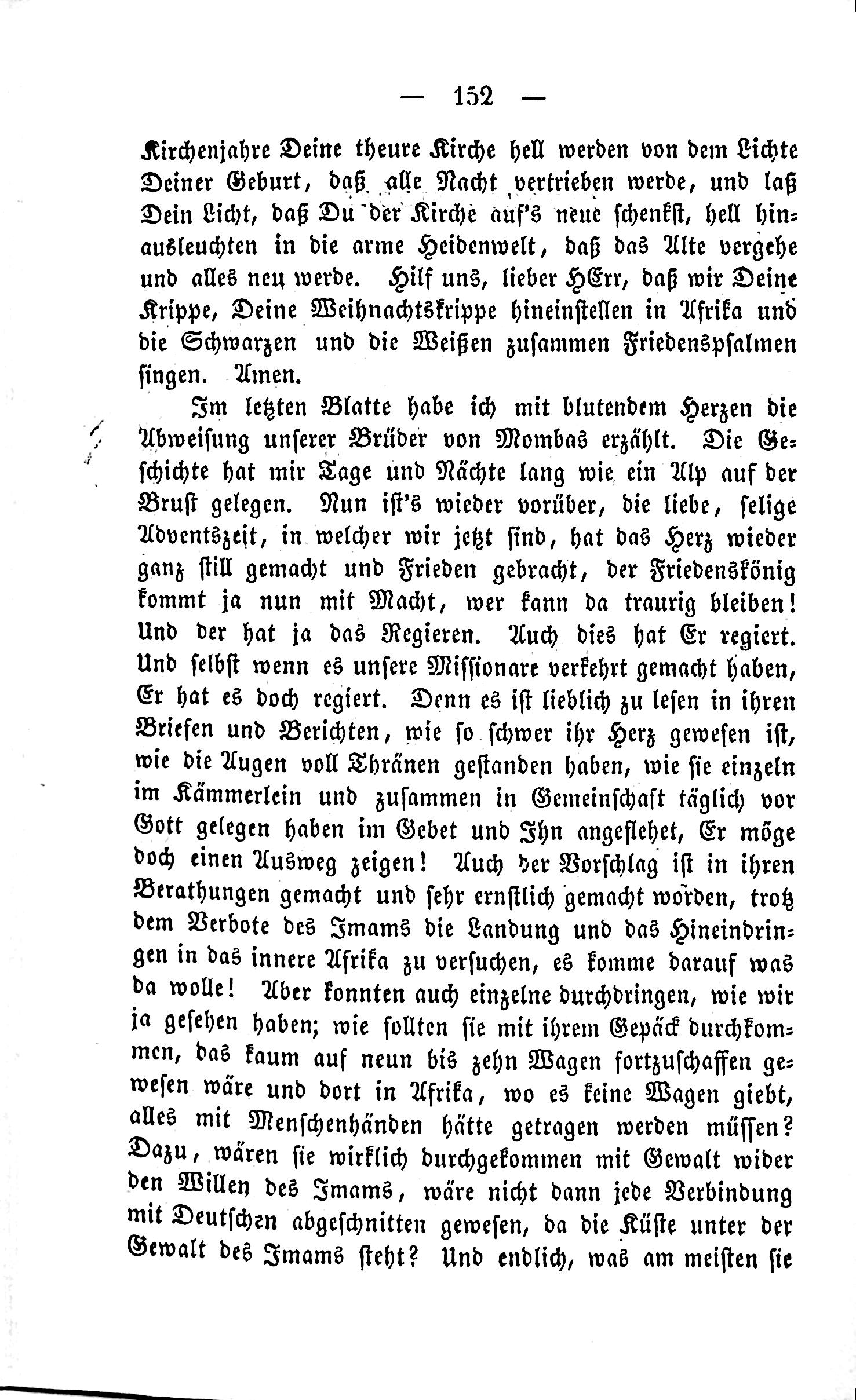 ——152-—— Church years. Illuminate Your Truth, That All Night May Be Lightened, and Let Your Light Shine, That You May Give It to the Church Again, Shine Outward, and Inward, to the Poor Heidelland, That the Old Shall Pass and All Be New. Help us, dear Lord, that we may establish Your Crib, Your Christmas Crib, in Africa and the Blacks and Whites together, singing Peace Psalms. Amen. In the last page, I recounted with a bleeding heart the rejection of our brothers from Mombas. The story has been like an Alp on my chest for days and nights. Now it is once again a fleeting moment, the dear, blessed Advent time, in which we are now, the heart has once again been completely still, and peace has been brought, the Peace King comes now with power! Who can remain sad-! And he has governed. And even he has governed. And even if our missionaries have erred, they have governed. For it is lovely to read in their pronouncements and reports, how so grievous their hearts have been, as if their eyes were full of thorns, standing alone in the chest and together in community every day before God, may He show us an escape! Also the suggestion is made in theirBMHTungen, and was very seriously made, despite the prohibitions against landing and entering into the inner Africa. It is about what is desired. But even a few could penetrate, as we saw in 1a, it would be difficult to cover all that with nine to ten wagons and there, in Africa, where there are no wagons, everything would have been carried by hand. And would they truly have made it through with violence VIII Willen of the Jmams, then every connection with Germans would have been severed, because the coast is under the violence of the Jmams.2 And finally, what is most