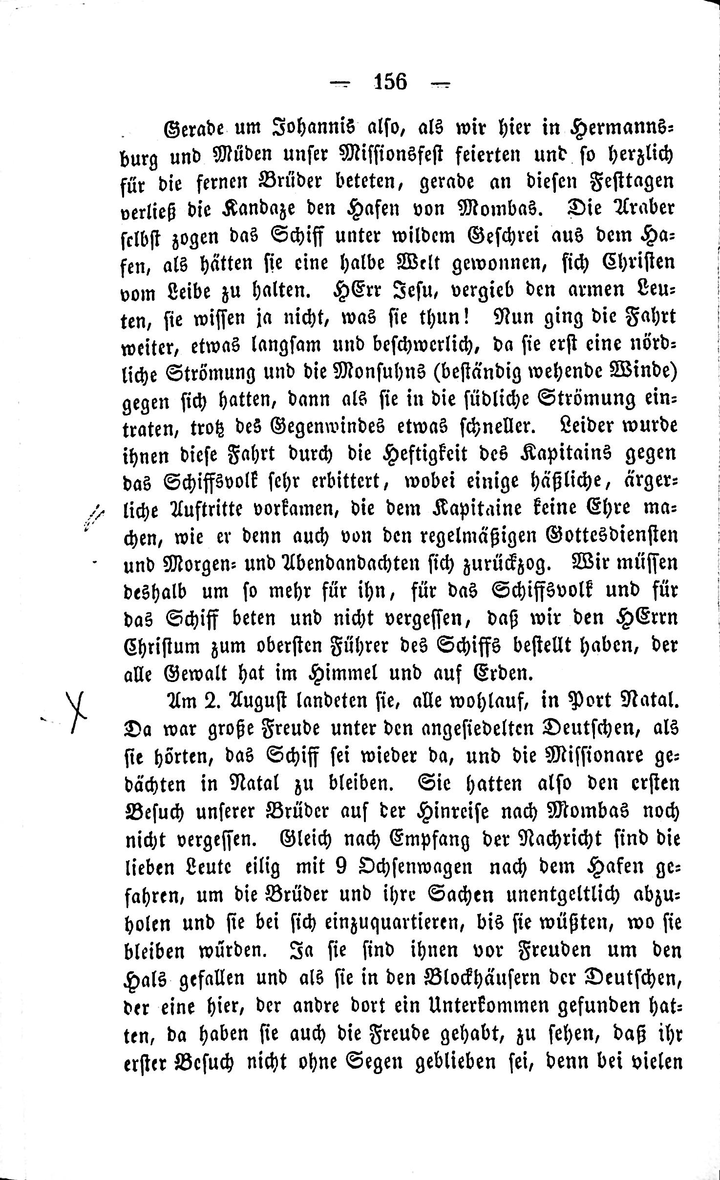 sk» »L- ——.156-—. . Gerade around Iohannis, as we celebrated our mission festival here in Hermann’s- bukg and Müden, and prayed for the distant brethren, we left the Kandaze ship in Mombas amidst wild screaming. They believed they had won half a world, keeping Christians as a tenant. HErr Jesu, pourfyle the poor leas, they know not what they do! Now the journey continues, slowly and difficultly, because they first entered a northern current and the Monsuhns (bestc"indig wehende Winde) against them, then when they entered the southern current, despite the wind, we were slightly faster-. Unfortunately, this journey was severely resisted by the captain, inflicting unpleasant and annoying acts on the captain, causing no honor to him. He then withdrew from the regular Gottesdiensten (church services) and morning- and evening-attendant duties. We must therefore pray more for him, for the ship's people, and for the ship itself, and not forget that we should bless the HErrn Christum (Lord Jesus) as the highest leader of the ship, who has power in heaven and on earth. On August 2nd, we landed in Port Natal, all safe and sound. Great joy among the Germans was felt when they heard the ship was back, and the missionaries were to stay in Natal. They had thus not forgotten the first visit of our brothers from the journey back to Mombas yet. As soon as the news was received, the kind people were rushing with 9 Ochsenwagen (ox carts) to the port to collect the brothers and their belongings, and house them with them until they knew where they would be staying. Yes, they have given us great happiness, and when we found the blocks (areas) of the Germans, where there is a here, a there a shelter- found, we also had joy.