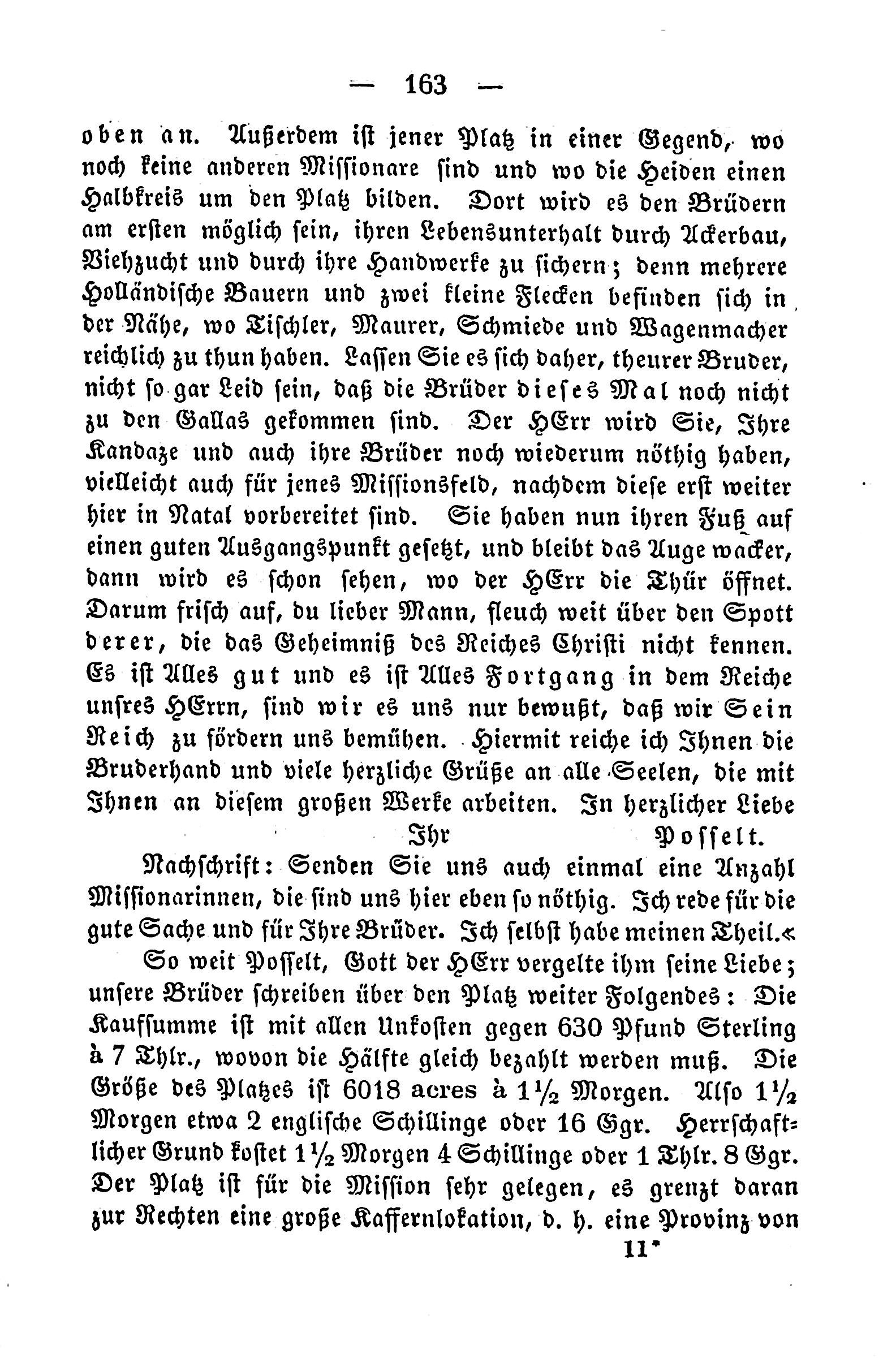 —163s-— Above the top. Also, there is a place in a region, where no other missionaries have been and where the shepherds form a half-circle around it. There will be the brothers first possible to secure their livelihood through farming, livestock, and crafts. Because several Dutch farmers and two small patches are located nearby, where carpenters, masons, and smiths have plentiful work to do. Therefore, dear brother, do not even let suffering befall the brothers this time. The Shepherd will need you, your family, and your brothers again, perhaps also for this mission settlement after they have arrived here in Natal. You have now set your foot on a good starting point, and keep your eyes open – then you will see where the Shepherd opens the door. So fresh, you dear man, let your eyes follow the Shepherd's gaze. Thus, you are fresh, you see. Dear man, let your eyes follow the Shepherd's gaze. Therefore, so far, you, dear man, follow the Shepherd's gaze. It is all good and there is progress in the Christian realm of our Shepherd. It is all good and everything is progressing in the Holy Church of our Shepherd. We are aware of it, that we strive to promote the Christian realm, and we strive to endeavor. Herewith I grant you the brother’s hand and many heartfelt greetings to all souls who are working with you on this large work. In heartfelt love - Your P o sselt. Also, send us once a number of missionaries, that are here so necessary. I speak for good causes and for your brothers. I myself have my part. ((So far, Posselt, God of the Shepherd, forgive him his love. Our brothers will continue writing about the place: The purchase price is with all costs against 630 pounds sterling, of which half must be paid. The size of the place is 6018 aores ä 11X2 square meters. Therefore, 172 square meters approximately 2 English shillings or 1 Thlr. 8 Ggr. Lord-ly basis costs 1 IX2 square meters 4 shillings or 1 Thlr. 8 Ggr. The place is very suitable for the mission, it borders on the right a large grain depot, which is a province of U