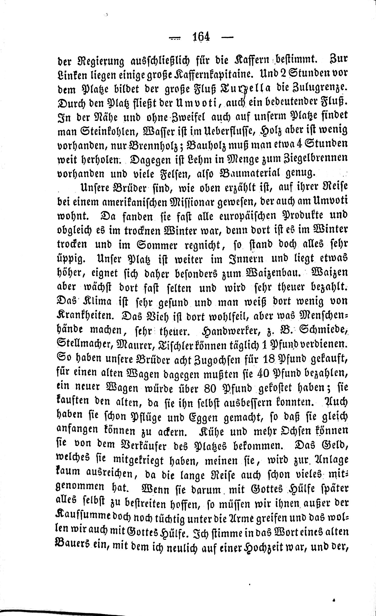 »W- der Regierung ausschließlich fiir die KassernspbestimmL Zur Linken liegen einige große Kassernkapitaine. Und2 Stunden vor dem Platze bildet der große Fluß Tu · ella die Zulugrenze. Durch den Platz fließt der Umv oti , aurlzein bedeutender Fluß. In der Nähe und ohne-Zweibel auch auf unserm Platze findet man Steinkohlen, Wasser ist im Ueberflusses, Holz aber ist wenig vorhanden, nur Brennholzz Bauholz muß man etwa 4 Stunden weit herholen; Dagegen ist Lehm in Menge zum Ziegelbrennen Vothanden und viele Felsen, also Baumaterial genug. . Unsere Brüder sind, wie oben erzählt ist, auf ihrer Reise bei einem amerikanischen Missionar gewesen, der auch am Umvoti Wohnt. Da fanden sie fast alle europäischen Produkte und obgleich es im trockenen Winter war, denn dort ist es im Winter trocken und im Sommer regnicht, so stand doch alles sehr OFka Unser Platz ist weiter im Innern und liegt etwas höher- eignet sich daher besonders zum Waizenbau. Waizen aber Wächst dort sast selten und wird sehr theuer bezahlt- D«H"KUMC ist sehr gesund und man weiß dort wenig von KJANkheikem Das Vieh ist dort wohlfeil, aber was Menschen- hande machen, sehr- theuer Handwerker, z. By Schmiede. Skellmachek- Maurer, Tischler können täglich 1 PfUU.VVekdietU. S»V Haben Unsere Brüder achtZugochsen fiir 18 Pfund gekauft, fklk Wen alten Wagen dagegen mußten sie 40 Pfund bezahlen, Un MU. Wagen würde über 80 Pfund gekostet haben; sie kauftespdm Akten- da sie ihn selbst ausbessern konnten. Auch haben sie schon Pflüge und Eggen gemacht, so daß sie gleich anfangen können zu ackem Kühe und mehr Ochsen können sie VVU dem Perkäuser des Platzes bekommen. Das Geld, Pelchks sie mitgektiegt haben, meinen sie, wird zur· Anlage Cum ausreichen- da die lange Reise auch schon vieles mit-« glemlom mm hak— Wenn sie darum. mit Gottes Hülfe später äxjrselbst zu bestreiten hoffen, so müssen wir ihnenaußer der ten wilkzlme dPch Noch tüchtig unter die Arme greifen Und das wol- chmitGkaeSHülse Ich stimme in das Worteines alten Bauers em, mit dem ich neulich auf einer Hochzeit w ar, und der, 」