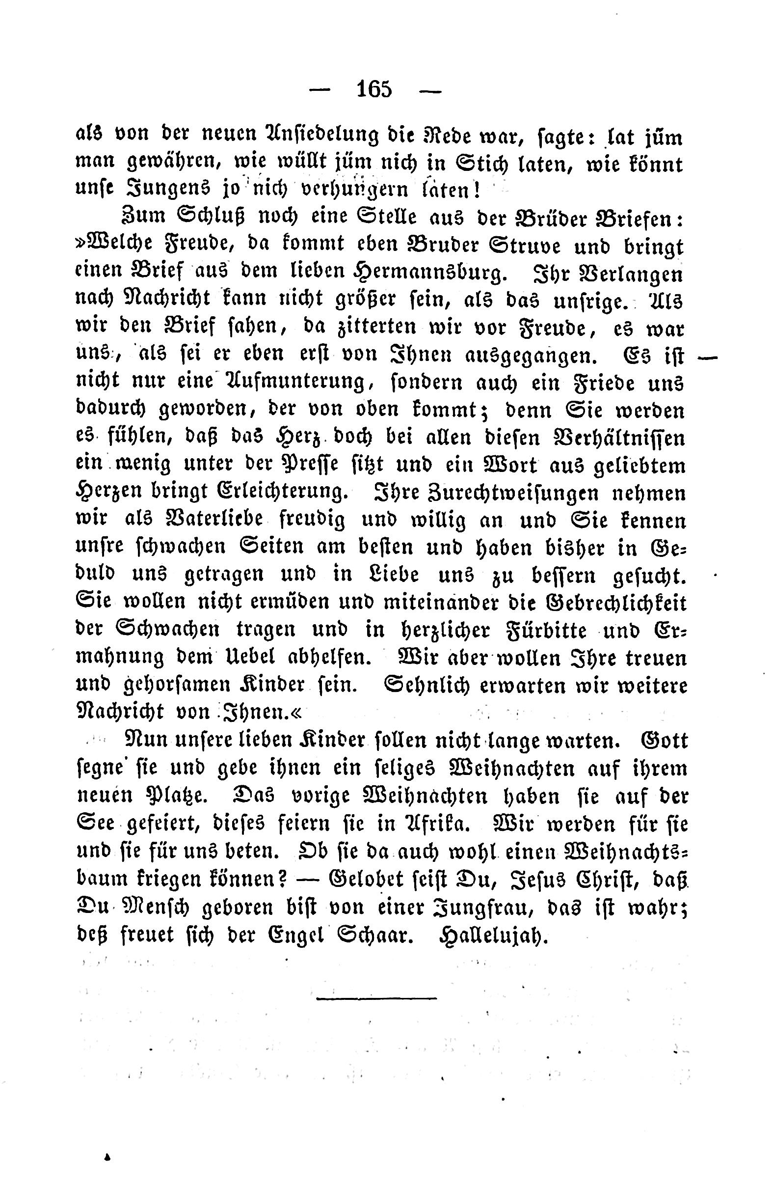 -165—— when the new settlement was spoken of, she said: “Let the wind give, how will it not let us in so much, like how can we not starve our young boys if they starve?” “Finally, a position from the Brothers Brieer- What joy, then, is brother Struve coming and bringing a letter from the dear Hermannsburg. Your desire for news cannot be greater than ours. As we saw the letter, we trembled with joy, it was us-, ·"as if it were just newly gone. It is not only one occurrence, but also a peace it has become, which comes from above, because you will feel that our heart is little under the press, and a word from a beloved heart brings relief. Your reprimands take us as a love, willingly and willingly, and you know our weak sides best, and have carried us in patience so far, and in love seek to improve us. You do not want to tire and together bear the weakness of the weak, and in heart-felt color sund we avoid. We but want to be your loyal and obedient children. We eagerly await another message from .Jhnen. « · Now, our dear children should not wait long. God bless them and give them a blessed Christmas on their new place. Last year’s Christmas was set on the sea-festigated, this they celebrate in Africa. We will be for them and they for us pray. Can they get a Christmas tree? —- You are blessed, Jesus Christ, that you were born from a virgin, this is true; it pleases the angel, Hallelujah.”