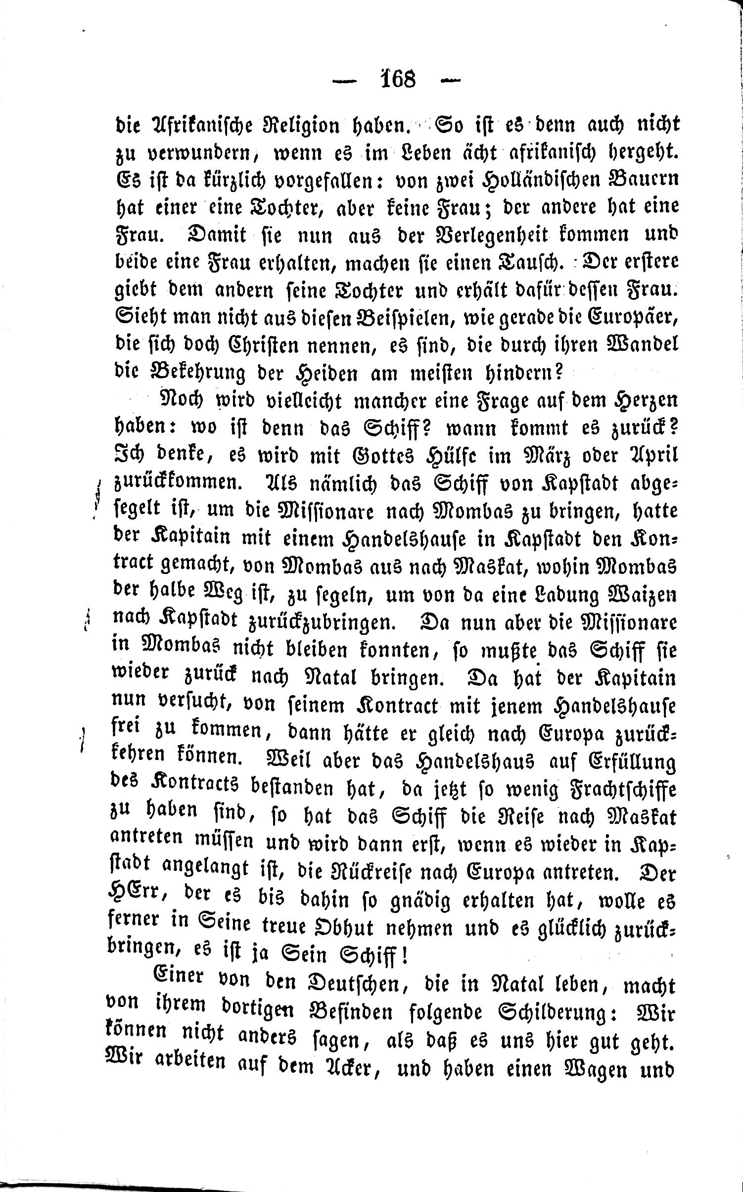 -—--. –I «68 – the African religion have.« - »So is it not surprising that it goes so well in life that there are eight African religions. It has recently happened in two Dutch farmers, with some children, but no woman; the other has a woman. With this, they make a trade. The first gives the second her daughter and receives in return a woman. One does not see in these examples, how recently the Europeans, who call themselves Christians, hinder the conversion of the tribes the most? Still, one may ask: where is the ship? When will it return? I think it will return with God’s help in March or April. As the ship of Cape Town departs, to bring the missionaries to Mombaå, the captain with a trading house in Cape Town had made a contract with a trading house in Mombas, to sail to Maskat, where Mombas' haka is to sail, to bring a shipment of Waizen to Cape Town. But now, that the missionaries were not able to remain in Mombas, the captain must come with his contract with the trading house, then he could have returned to Europe. Because the trading house has fulfilled the contract, so now there are so few ships to have, the ship must have traveled to Maskat and then must return to Cape Town when it returns to Cape Town. The purpose of this is that until then, it must have been sailing to Maskat and then back to Europe. The meaning of this is that up to now it has been so tolerable, I want to take its care until now. It is its ship! - »One from the Germans who live in Natal, there is the following depiction of the situation: We do not say differently that it is well-being here for us. We work on the farm, and we have a cart and