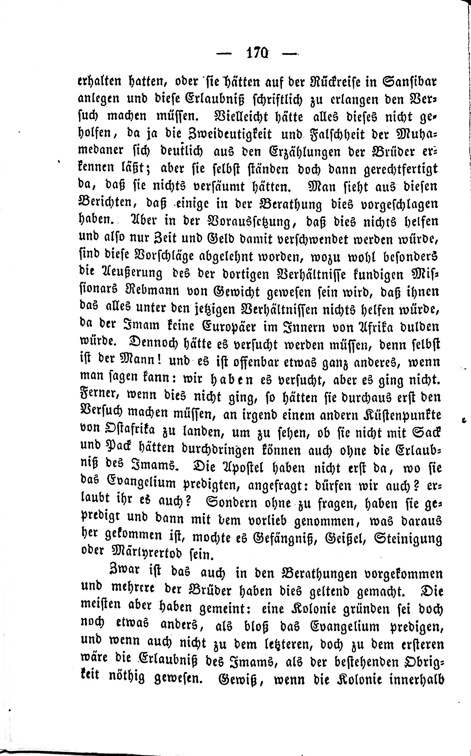 —- 170 —- erhalten hatten, or they would have been on the next voyage in Sansibar and obtained this permission to make them must. Perhaps all this would not have been useful, because of the duality and falseness of the Mahadesaner. Maybe everything about this wouldn’t have been worth it, because of the second ambiguity and falsehood of the Mahadesaner themselves, but they were still justified in their own rights. One sees in this report that some in the Berathung proposed this. But in the initial condition, that this would not be useful, so only time and money would be wasted. These suggestions have been rejected, why is this especially the expression of the present circumstances so important for the missionaries Rebmann Von Gewicht, who had been to this in the current circumstances. Since the Jim has no Europeans within Africa. Nevertheless, it would have been attempted, because even the man! it appears to be something entirely different if one can say: we have tried, but it didn’t work. Jim if this wasn’t possible, then they would have had to undertake this attempt, landing at some other point VVU East Africa, to see if they could not penetrate through with a sack and pack, without the permission of the Jmams. The Apostles didn’t first preach where they had been, did they? did not they also preach, and then with what came from it - may it be imprisonment, torment, stoning or martyrdom. - Yes, this has come before in the Berathung as well. And several of the brothers have invoked this. The most important point is that they did not just preach, but also the last thing that came from it - may it be imprisonment, torment, stoning or martyrdom. - Yes, this has come before in the Berathung as well. And several of the brothers have claimed this. The most important thing is that they meant to establish a colony not just to preach the gospel, and if it wasn’t for the first, then the permission of the Jmams would be the best existing obligation. Indeed, if the colony within . - .»—. .-..-.»-—-.--»—.--..—J
