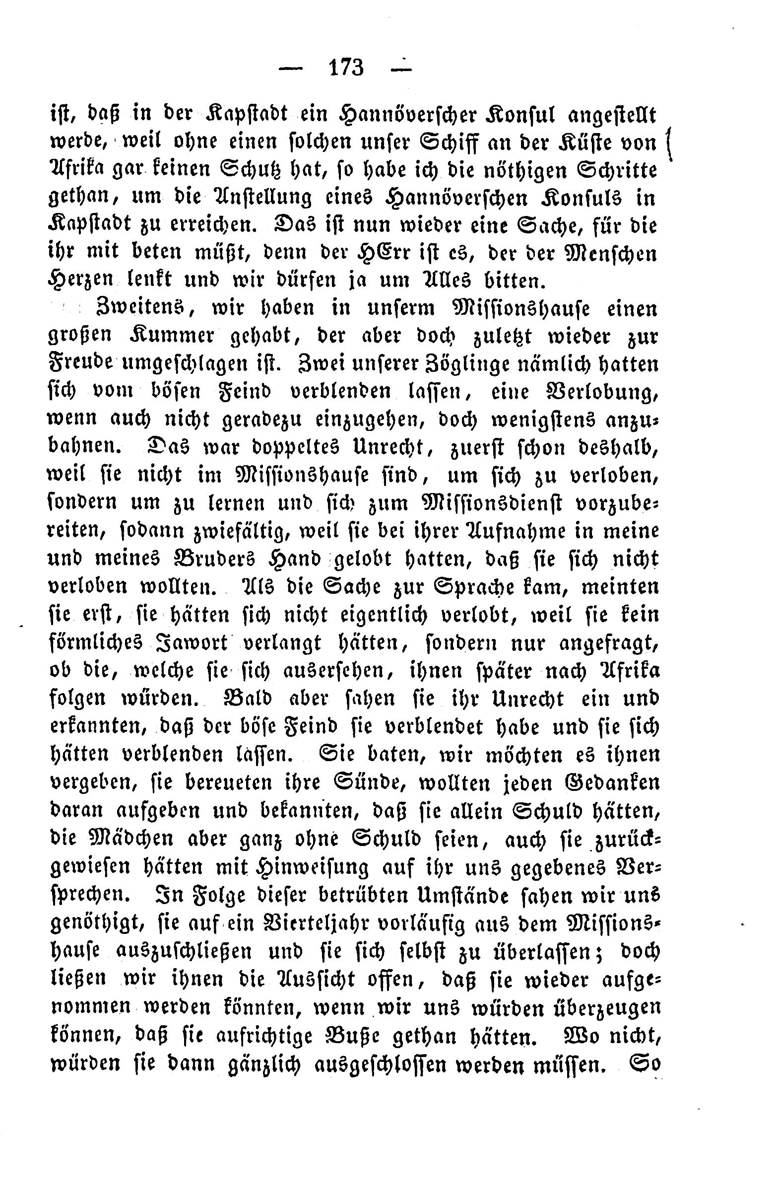 —173— It is, that in Cape Town, a Hannoverer Consul is appointed – because without him, our ship has no protection on the coast of ( Africa). So, I have made the necessary steps to achieve the appointment of a Hannoverer Consul in Cape Town. This is now again a matter for you to pray for, for the Lord directs the hearts of men, and we are to ask for all things. Secondly, we have suffered great trouble in our mission house, but which eventually again brings joy. Two of our boys, however, had concealed themselves, a promise, though not necessarily to be made, but at least to be announced. That was double wrong, first because they were not in the mission house to be engaged, but to learn and prepare themselves for the mission service, then undeniably, because they were praised by me and my brother upon their admission into my and my brother’s hands. As the matter came to hand, they first thought they would not actually promise, because they did not demand a formal law word, but only requested, whether they would follow them later to Africa. But soon they saw their sin, and realized that the evil enemy had blinded them and that they would have concealed themselves. They begged us, we want to forgive them, regret their sin, want to give up all thoughts of it, and said that they were entirely responsible, while the girls were completely free of guilt, and returned them with a reference to what we had given them to speak. As a result of this troubled circumstances, we were refused to exclude them from the mission house for a preliminary period; but we allowed them to be allowed to be re-appointed if we could be convinced that they had truly repented. Where not, they would then be completely excluded. So.