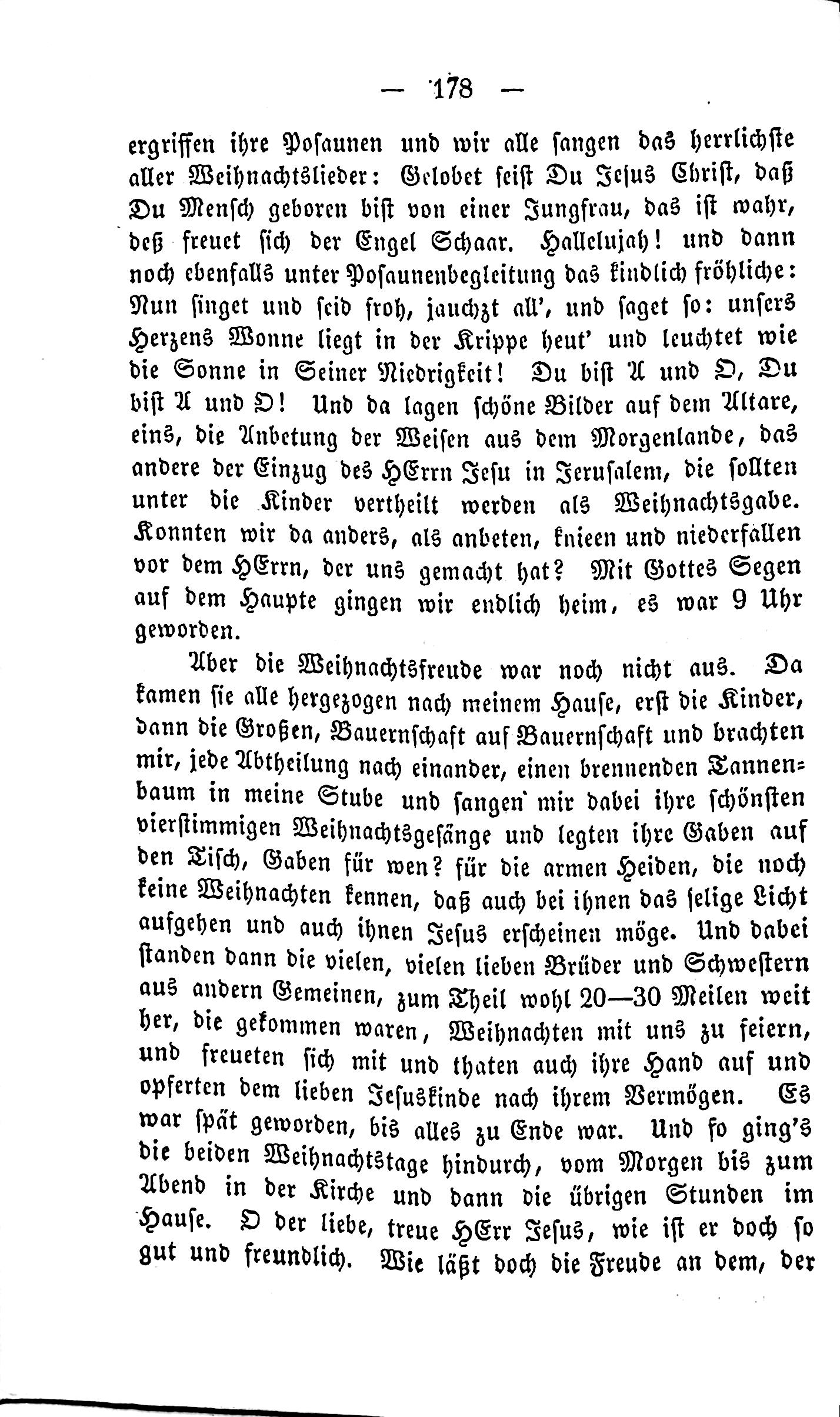 178 – Griefed their pikes and we all sang the most glorious of all Christmas songs: “Praise be to you, Jesus Christ, that you were born of a virgin, this is true – it was said by the angel Gabriel. Hallelujah. And then also, under the command of the bells, the child-like joyful: Now sing and be happy, let all rejoice, and say, and let us bestow upon our hearts the joy that is in the crib today, and shine like the sun in its lowliness. You are A and O! And there were beautiful pictures on your altar, one – the veneration of the Wise Men from the morning land, another the entrance of the Lord Jesus in Jerusalem, that should be shared with the children. Could we not stand in prayer, kneeling and falling down, before the hood of the clothes you made us? With God’s blessing from the top, we finally went home, it had been nine o’clock. But the Christmas cheer was not yet out. They came all at once, gathered around my house, first the children, then the adults, the farmers' levy, bringing me every ballad one after another, a burning Christmas tree in my sitting room, and catching them in its beauty, and then their most wonderful Christmas gifts. Where did they place them? For the poor shepherds, who have not yet known Christmas, that even they may relinquish the blessed light – and that Jesus may appear to them too. And then came many – many loving brothers and sisters from other common people – from miles of 20 to 30, came to celebrate with us, and took their hands and pressed them with the love of the dear child after their inheritance. It was late, until everything was finished. And you two Christmas days, from morning to evening in the church, and the remaining hours in the house… O, dear, loyal Jesus, how good and friendly you are.