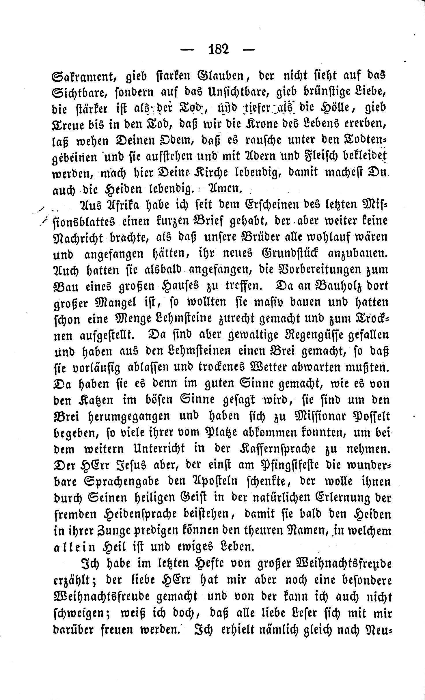 Sacrament, strong faith, that does not look at the visible, but at the unseen, ardent love that is stronger than death. Give me ardent love that is stronger than death. Judge those who desecrate hell, give faithfulness until death, that we may raise the crown of life, weave your breath, so that it flows under the dead. Give them to stand and be clothed in flesh and blood, make here your church alive, so that you may. Also, the devils are alive. · - » I have since since since from the appearance of the last Mis- Xsionsblatte a short letter, but it did not bring any news, as our brothers all were in the midst of it and began to build their new land. Also, they began to make preparations for building a large house as soon as there was great need for wood, so they had already made a large amount of timber and had already laid down a lot of lime stones, but heavy setbacks fell and made a muck from the timber, so they had to relieve it temporarily and wait for the dry weather. Then, have they done it in a good sense, as it is said by cats in evil ways, they walked around the muck, and to be missionaries of the old, they were able to remove so many from the platze, to allow for further learning in the language of the friends to come. Jesus, the once-wonderful speech gave to the apostles on the feast day, may grant to them through His sacred spirit in the natural learning of the foreign peoples, so that they may soon be able to preach the names of the, in which alone is healing and eternal life. I have in the last edition of great Christmas cheer told to me, but the dear Lord has made me another special Christmas joy, and I cannot not speak of it; I know that all loving readers wish to hear from me.