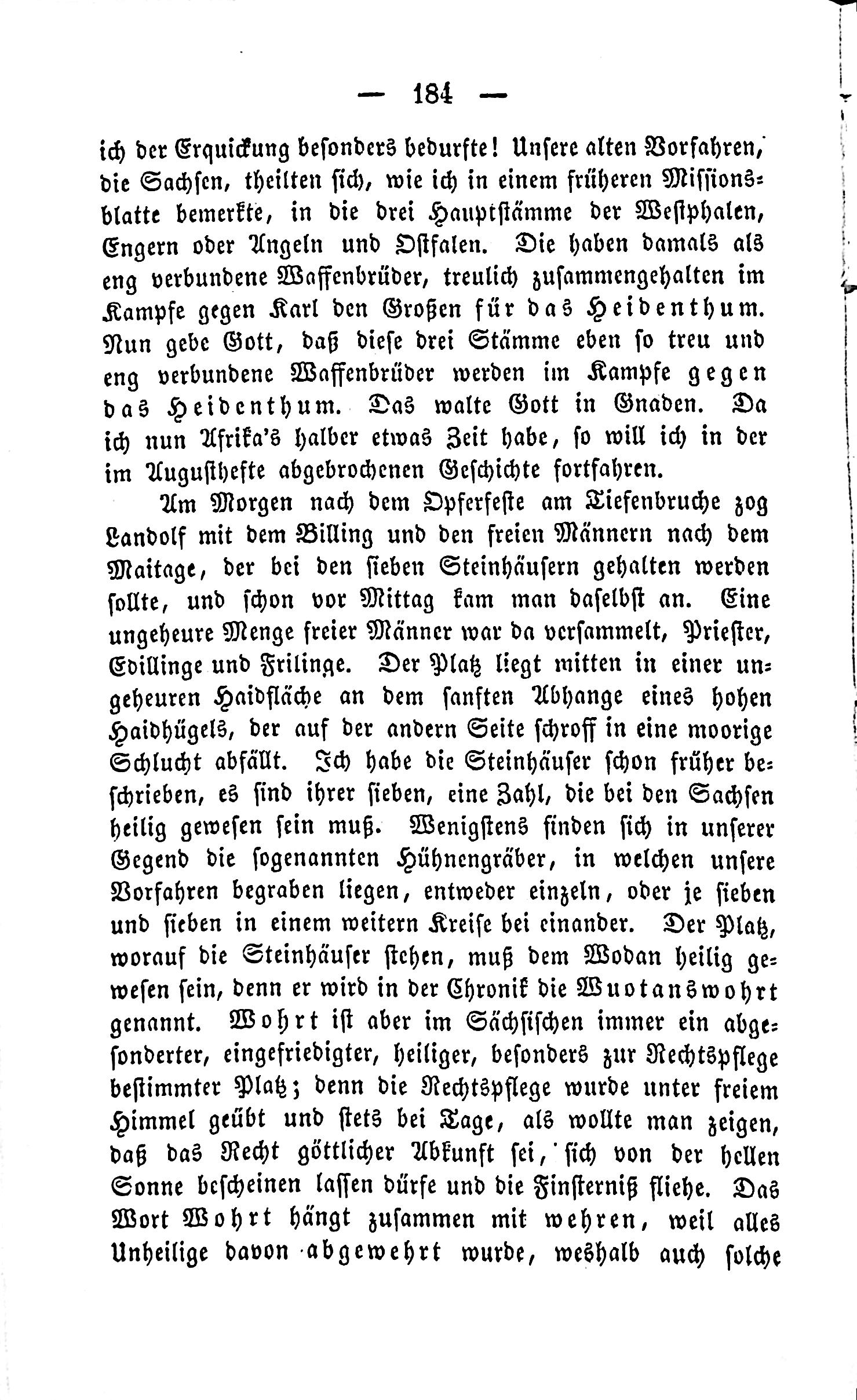 Ich der Erquickung bedurfte! Unsere alten Vorfahren, die Sachsen, teilten sich, wie ich in einem früheren Missionsblatt bemerkte, in die drei Hauptstämme der Westphalen, Engern oder Angeln und Ostfalen. Sie hatten damals als eng verbundene Waffenbriider treulich zusammengehalten im Kampf gegen Karl den Großen für das Heidenthum Nun gebe Gott, dass diese drei Stämme eben so treu und eng verbundene Waffenbriider werden im Kampfe gegen das Heidenthum. Das walte Gott in Gnaden. Da ich nun Afrika’s halber etwas Zeit habe, will ich in der im Augusthefte abgebrochenen Geschichte fortfahren. Am Morgen nach dem Opferfeste am Tiefenbruche zog Landolf mit dem Billing und den freien Männern nach dem Maitage, der bei den sieben Steinhäusern gehalten werden sollte, und schon vor Mittag kam man daselbst an. Eine ungeheure Menge freier Männer war da versammelt, Priester, Edillinge und Frilinge. Der Platz liegt mitten in einer un- geheuren Haidfläche an dem sanften Abhange eines hohen Haidhiigels, der auf der andern Seite schroff in eine moorige Schlucht abfällt. Ich habe die Steinhäuser schon früher be- schrieben, es sind ihrer sieben, eine Zahl, die bei den Sachsen heilig gewesen sein muss. Wenigstens finden sich in unserer Gegend die sogenannten Hühnengräber, in welchen unsere Vorfahren begraben liegen, entweder einzeln, oder je sieben und sieben in einem weitern Kreise bei einander. Der Platz, worauf die Steinhäuser stehen, muss dem Wodan heilig ge- wesen sein, denn er wird in der Chronik die Wuotanswohrt genannt. Wohrt ist aber im Sächfischen immer ein abge- sonderten eingefriedigter, heiliger, besonders zur Rechtspflege bestimmter Platz; denn die Rechtspflege wurde unter freiem Himmel geübt und stets bei Tage, als wollte man zeigen, daß das Recht göttlicher Abkunft sei,·sich Von der hellen Sonne bescheinen lassen dürfe und die Finsterniß fliehe. Das Wort Wohrt hängt zusammen mit wehren, weil alles Unheilige davon -abgewehrt wurde, weshalb auch solche