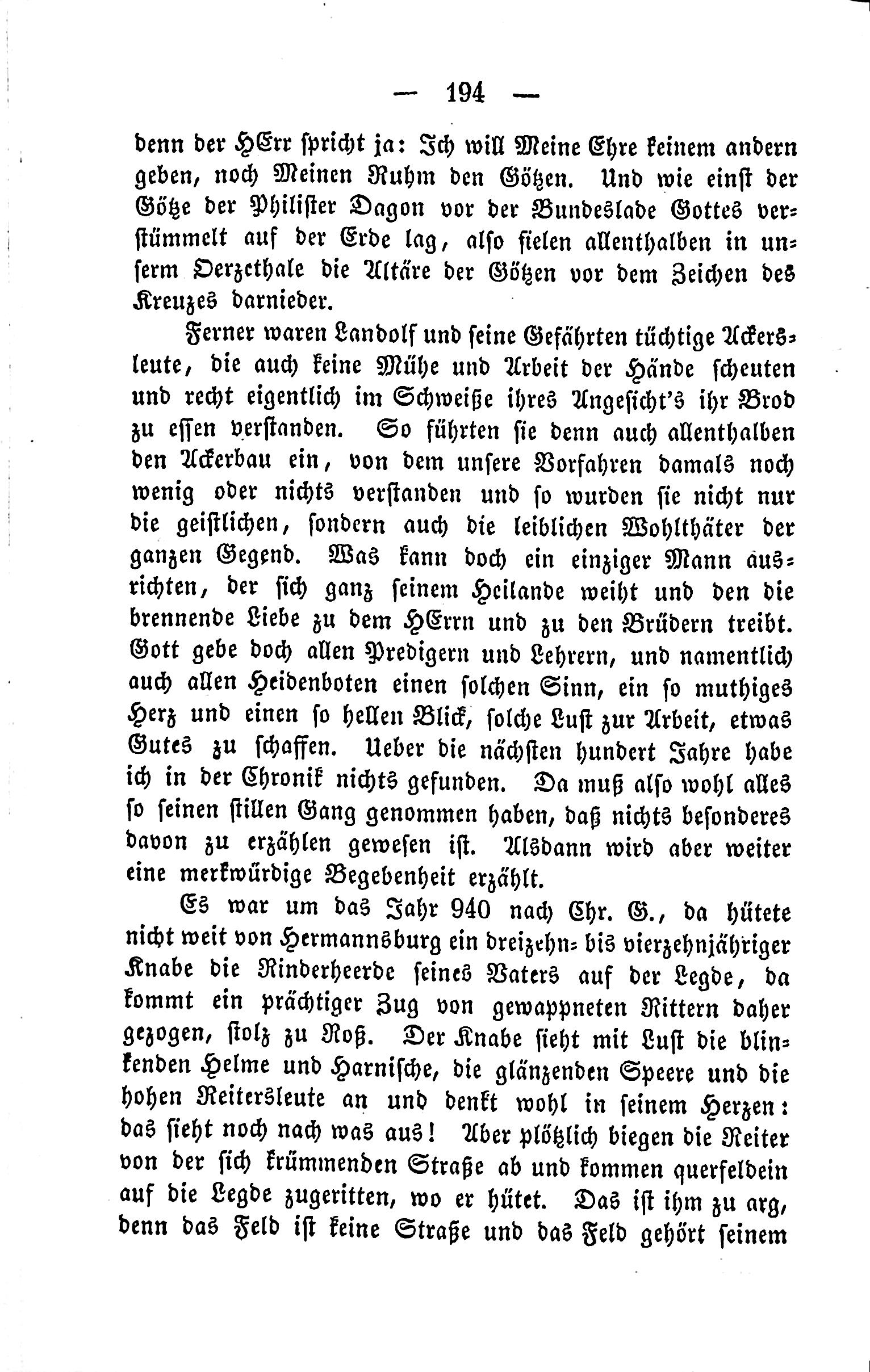 —194— denn the lord speaks, and I will not give my honor to any other. Nor will I exalt my name to the gods. And as once the god of Philistine, the Gophist, lay deformed on the earth, all over, the Altiire of the gods in the whole land were lowered before the sign of the cross. - Furthermore, Landolf and his companions were skilled farmers, diligent and hardworking, who understood the art of farming and worked in the fields with a sincere purpose. Hence, they established the farming industry, which our ancestors once understood little, and became the protectors of the entire land. What can one man achieve who dedicates himself entirely to his God and is driven by the burning love for God and his brethren? God grant to all preaching and teachers, and especially to all heretics, such a sense of wisdom, a brilliant heart, and a bright gaze. May this desire for work, and the creation of good, be present in such a man. In the next hundred years, there was nothing special recorded in the chronicle. Therefore, it must have been that everything settled into its quiet course, and nothing particularly noteworthy would be recorded. But then a strange occurrence will be told. It was in the year 940 after Christ, when not far from Hermannsburg, a young boy guarded the herd pen of his father’s, when a grand procession of armored knights arrived, proud to ride. The boy gazed with delight at the dim houses and ladies, adorned with gleaming swords and the high-ranking lords, and thought in his heart - what was still to come? But suddenly, the riders of the road turn away and come swiftly across the field, where he protects. It is an obstacle for him, for the field is not a road, and the field belongs to him.