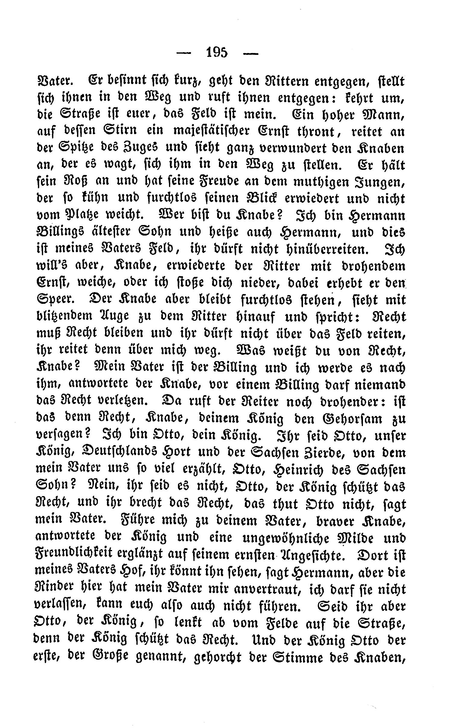 Vater. He remembers, goes ahead, puts himself in the way of the knights, calls out to them to turn around. The road is yours, the field is mine. A man on horseback, his brow is perched, rides at the head of the procession and looks at the boy who dares to step between them. He stops his horse and has great joy at the brave boy who doesn’t waver. Who are you, boy? I am Herinann Billings' eldest son, and I am also Herinann, and this is my father's field. You mustn’t ride over it. I want it, boy, he calls out, riding with a threatening severity, to yield or I will strike you down. The boy but stands firm, looks at the knight with a brilliant eye and speaks: “Justice must be justice, and you must not cross the field. You ride over me, then.” What do you know about justice, boy’s words? My father is Billing, and I will follow him, said the boy, "A Billing must not infringe on the right of anyone." The rider cries out, "Is that justice, boy, to betray the King’s obedience?" I am Otto, your king. You are Otto, our king, Germany's treasure and the Saxon splendor, and from which my father told me so much about Otto, Heinrich of the Saxon line? No, you are not, Otto, the king protects the right, and you break the right that Otto does not. Lead me to my father, brave boy, said the king and a peculiar kindness and warmth radiates from his serious countenance There is my father’s house, says Herinann, but the cows here have entrusted to me, I cannot leave them. Behave yourselves, Otto, the king – guide away from the road, for the king protects the right. And Otto, the first and greatest, obeys the voice of the boy.