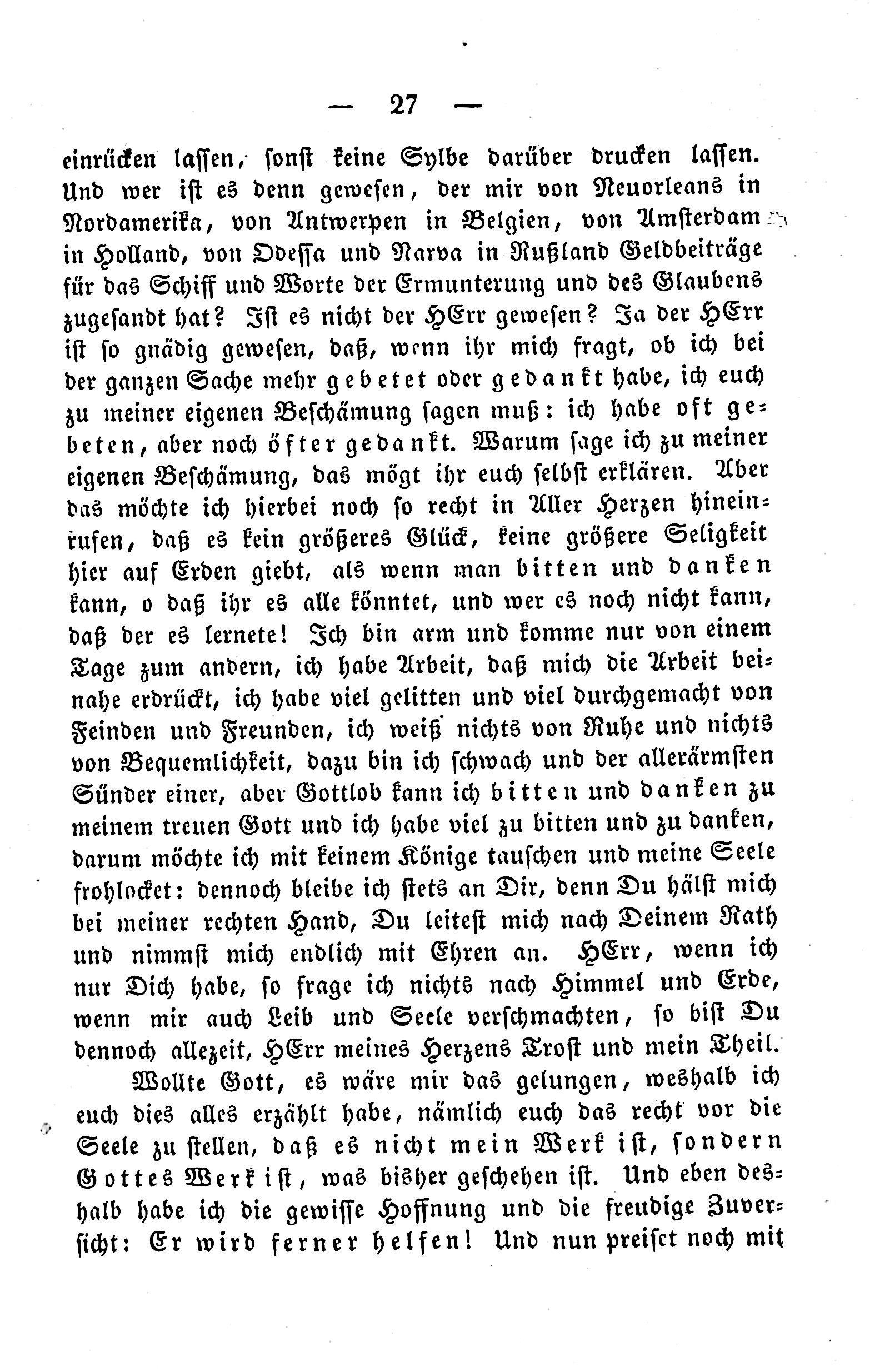 Translate from German to English: –27-.. einrlicken lassen-« else no Sylbe overprint to print. And who was it that was, who gave me from Neu Orleans in North America, from Antwerp in Belgium, from Amsterdam Its in Holland, from Odessa and Narva in Russia money deposits sent to the ship and words of encouragement and faith, and is not it the Lord who was? Yes, the Lord is so gracious that, if you ask me if I should contribute more or give more, I must confess to my own shame. I have often prayed, but even more I have thanked. Why do I confess to my own shame? You must yourself explain this. But this I here, in all my heart, call out, that there is no greater happiness, no greater bliss here on earth, than to be able to ask and thank, that you all could do it, and who hasn't yet learned! I am poor and come only from day to day, I have work that brings me near to death, I have suffered much and have endured much from enemies and friends, I know… nothing about peace, and nothing about comfort, that I am weak and the poorest sinner of all, but God, I can pray and thank to my loyal God, and I have much to pray and thank for, that you all could do it, and who hasn't learned it? I am grateful, and come only to my own God, and I want to hear God’s name, and I am still there. God, it would have been a great event for me to be with you, because it would be good for me to have no exchange with kings, and my soul rejoices, still, I remain always with you, because you lead me by your hand, and take me in honor. Lord, if I only have you, I ask nothing about heaven and earth, if my body and soul are lost, so you are always, your heart’s peace and my part. God, it was a great event to tell you this, to place it before your soul, that it is not my work, but the work of God is, what has happened before. And now, half, I have the certain hope and the joyous certainty: He will also help further! And now praise by name with
