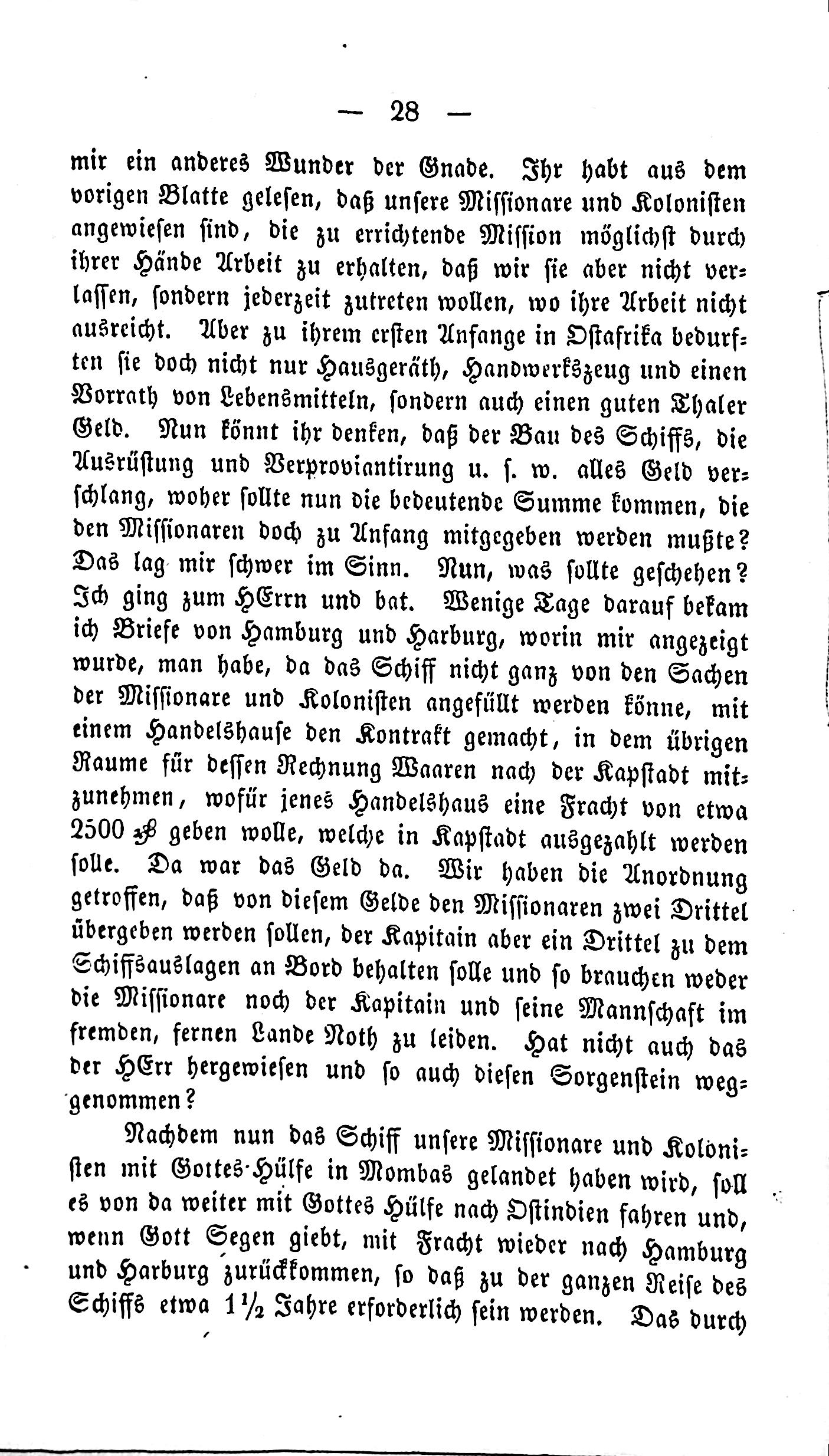 —28-. I yearn for another marvel of grace. You read from the previous leaf that our missionaries and colonists are instructed to establish a mission, and that we should not leave them, but rather strive to let them work with their own hands, so that we may not abandon them, but rather want to take them whenever their work is insufficient. But to their initial beginning in East Africa, you do not only build houses, crafts, and provisions of food, but also a good salary. Now you can think that the construction of the ship, the equipment, and the provisioning are all arranged for money, where should the significant sum that was given to the missionaries at the beginning with come? It was a difficult thing for me to think about. Now, what should happen? I went to Hamburg and Harburg, and received letters from Hamburg and Harburg, which indicated that the ship could not be completely filled with the missionaries and colonists' belongings, with a trading house a contract made, in which the remaining room for its fee was to be paid, with an amount of about 2500 N paid out in Cape Town. That was the money there. We agreed to set aside the amount of money for the missionaries three-quarters, and the captain takes one-third of the ship's expenses ashore, so that neither the missionaries nor the captain and his crew should have any troubles in a distant land. Did not the HErr also show this, and so also remove this troublesome stone? After the ship has arrived in Mombas with God's help, it will continue on its journey to East Indies from there, and, with God’s blessing, return to Hamburg and Harburg, so that the entire journey of the ship takes approximately 172 years.