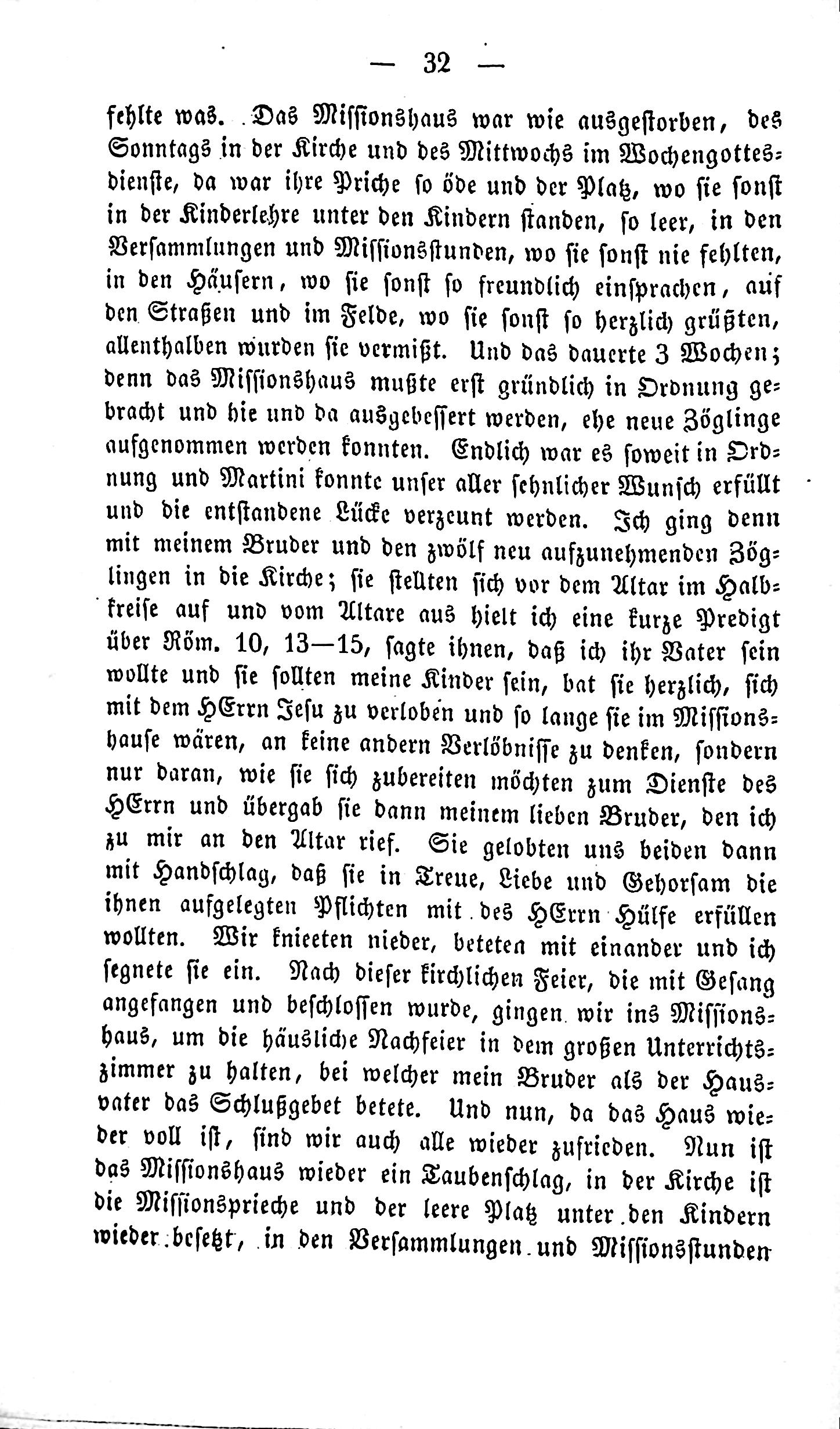 —32-“failed.” .The Mission House was like the death of Sunday in the church and Wednesday in the Wochengott-day, so was empty and the place where they should be, was so empty, in the assemblies and missions hours, where they never failed- in the house where they were always so friendly greeting, on the streets and in the field, where they always greeted so warmly, all together, they were missing. And that lasted 3 weeks, then the Mission House had to be thoroughly repaired and corrected, before new novices could be accepted. Finally, it was all the way in order and Martini could fulfill our all hopeful wish and undo the created gap. I went with my brother and twelve new arriving Zöglinge (guests) to the church; they appeared before the altar in the circle, and I held a short sermon about Romans 10, 13—15, said to them that I wanted to be their father and let them be my children, asked them kindly to agree with the Lord, and so long as they were in the Mission House, they should not have any other bonds. But only to how they would prepare for the service of the Lord and then handed it to my dear brother, who was to me at the altar. They then swore to us both with a handshake that they would fulfill the duties assigned to them by the Lord. We knelt down, prayed with us, and I blessed them. After this church service, which began with singing and was decided upon, we went to the Mission House to hold a household feast in the large classroom, where my brother was the house father and delivered the final prayer. And now, since the house is full, we are all once again satisfied. Now the Mission House is again a call, in the church is the Mission prieche and the empty space under the children again.