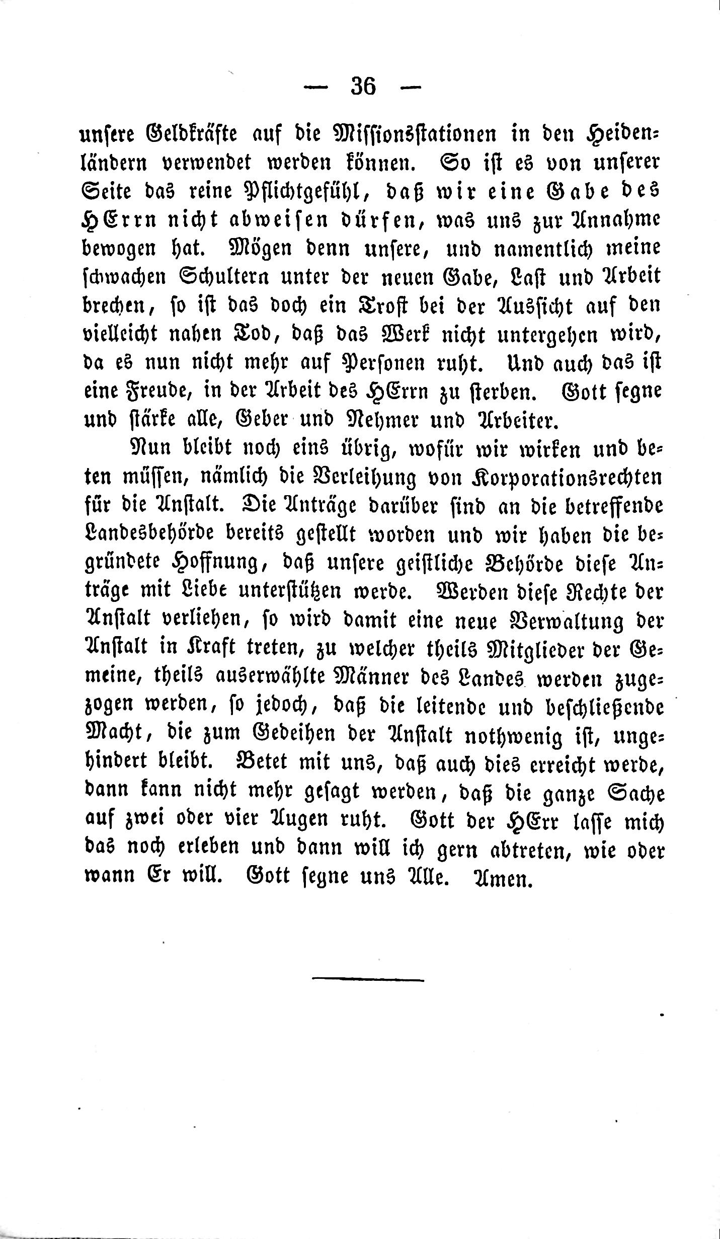 Translate from German to English: Our money is used on the missions stations in the Heiden lands. So it is from our side that there is pure duty, that we must not reject our lord, which has moved us to acceptance. May then our, and especially my weak shoulders under the new gift, burden and work break, so is it a comfort at the prospect of the possibly near death, that the work does not end- that it may not be extinguished- because it now does not rest on people. And also this is a joy in the work of the lord, to die. God may bestow and strengthen all, givers and recipients, and workers. Now there is one remaining, what we are working. And we must, namely, the granting of corporate rights for the institution. The applications from the relevant administrative authority have already been submitted, and we have the hopeful thought that our spiritual authority will support these applications with love. If these rights are granted, then a new administration for the institution will take effect, to which the members of the people will be drawn, but only if the leading and overseeing principal « power, that is needed for the prosperity of the institution, does not cease. Pray with us that this also is achieved, then we can not say that the whole thing is only two or four eyes. God, Lord, let me experience this one more time, then I would gladly retire, as or when He wills. God bless us all. Amen.
