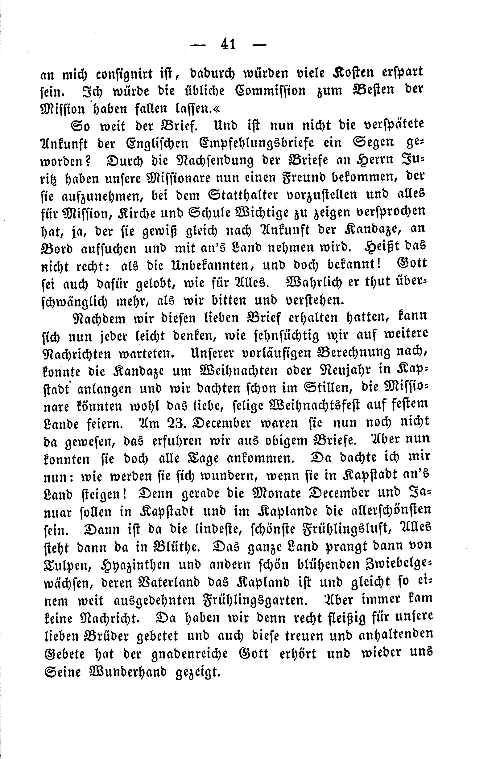 41. It is stored there, therefore, many costs would be saved. I would let the usual commission fall by the wayside. «So far as the letter goes. And is now not a blessing that the English recommendations have been sent? Through the sending of the letters to Mr. Joshua, our missionaries have received a friend who will receive us, presenting the statthalter and promising everything for mission, church, and school. Yes, certainly, he will immediately take them aboard upon arrival of the Kandaze, onboard. Does not this not right: as the unknown, and yet known! God be praised how much more he does over-all. Truly, he doth more than we ask and understand. After we received this lovely letter, each person can now easily think about waiting for further news. Our preliminary calculation, after this, would have the Kandaze arrive in Cape Town by Christmas or New Year’s. We thought already in silence, that the mission could well celebrate the Christmas feast on a solid land. On the 23rd of December, they were not yet there, and we find out from this letter. But now they can come every day. I thought, then, that they would be wondering, when they arrive in Cape Town! Because the months of December and January are supposed to be the most beautiful in Cape Town and in the Cape region. Then there is the most gentle, beautiful spring air, everything stands there in bloom. The whole land is adorned with tulips and other beautiful onion varieties, whose fatherland is the Cape region, and so is it equivalent to a wide-ranging spring garden. But there is no message. Therefore, we have diligently prayed for our dear brothers, and the merciful God has heard our miracles once again.