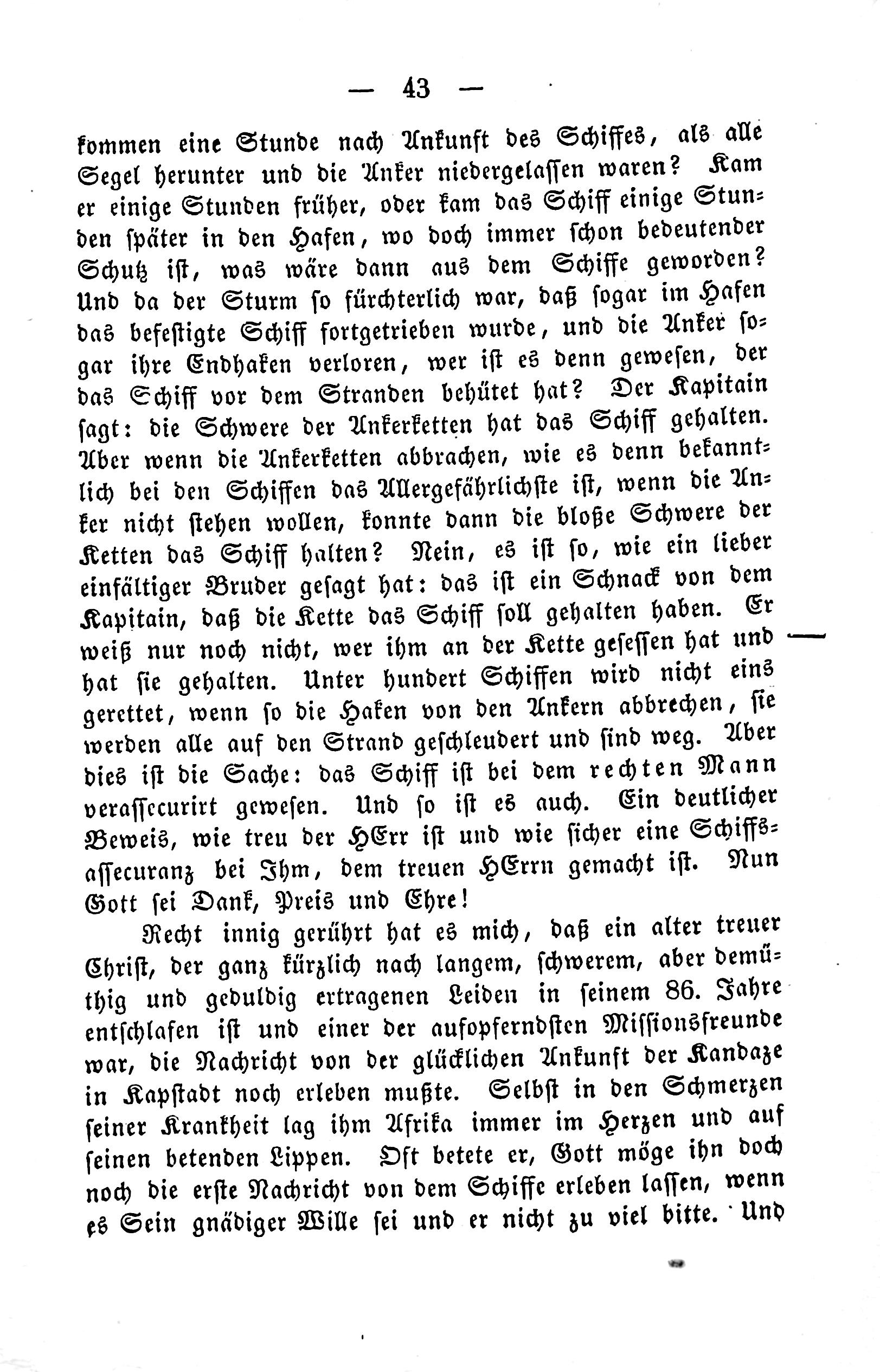 —43. come one hour after arrival of the ship, when all sails have been lowered and the anchors have been dropped? Did he come some hours earlier, or did the ship come some time later into the harbor, where there is always a significant protection? What would then have been of the ship? And since the storm was terrible, even in the harbor, the fixed ship was driven away, and the anchors were lost their endhooks. Who is it that has saved the ship? The captain says: the weight of the anchor chains has held the ship. But if the anchor chains break, how is it then known-ly? It is so, as a dear brother said: it is a nuisance of the captain, that the chain should hold the ship. He only knows who has sat on the chain and has held it. Under a hundred ships, not one is saved if the hooks break, they are all flung ashore and disappear. But this is the thing: the ship is secured to the right man. And so it is also. A clear proof that the hero is faithful and the assurance of a ship's safety is secure in him, the loyal hero. Now, thank God, with a profound sense of gratitude, it pleased me that an old faithful Christian, who recently endured long and arduous suffering for many years, finally decided to experience the message of the ship's arrival. Even in the pain of his illness, he was always in Africa and on his lips. He often prayed, may God grant him the first message of the ship to experience. If it is his merciful will and he doesn't ask for too much.