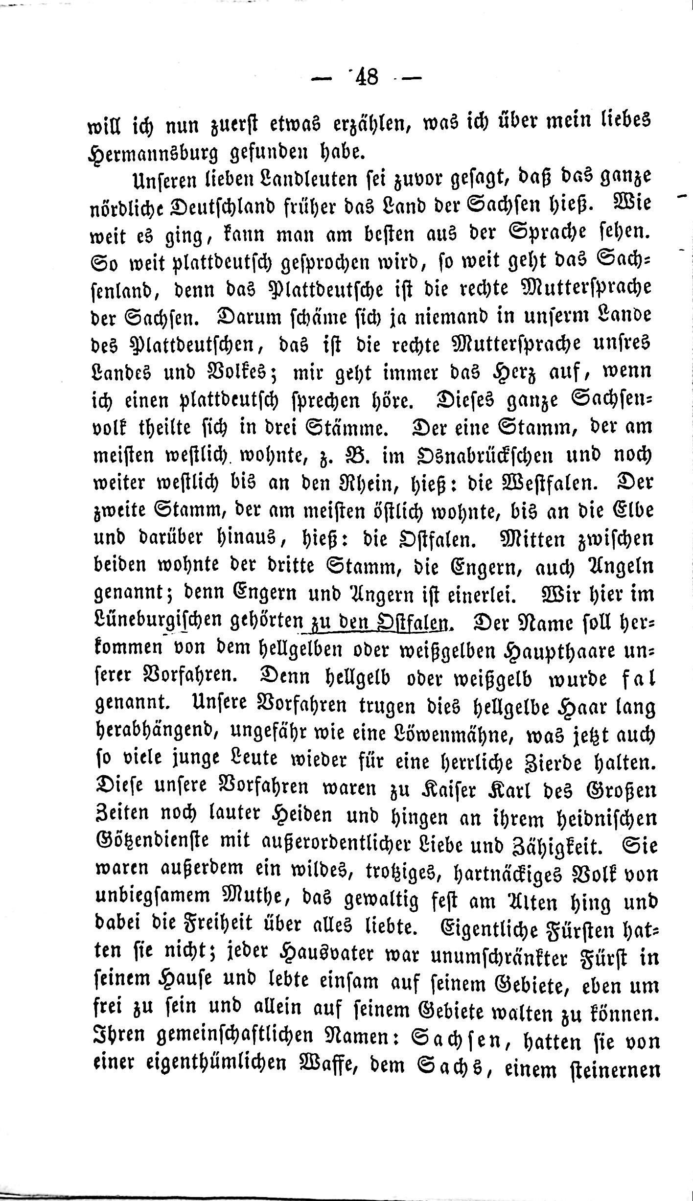 — —48 .- will ich nun zuerst etwas erzählen, was ich über mein liebes Hermannsburg gefunden habe. Unseren lieben Landleuten sei zuvor gesagt, daß das ganze nördlichc Deutschland früher das Land der Sachsen hieß. Wie weit es ging, kann man am besten aus der Sprache sehen. So weit plattdeutsch gesprochen wird, so weit geht das Sach- senland, denn das Plattdeutsche ist die rechte Muttersprache der Sachsen. Darum schäme sich ja niemand in unserm Lande des Plattdeutschen, das ist die rechte Muttersprache unsres Landes und Volkes; mir geht immer das Herz auf- Wenn ich einen plattdeutsch sprechen höre. Dieses ganze Sachsen-volk theilte sich in drei Stämme. Der eine Stamm, der am meisten westlich wohnte, z. B. im Osnabriickschen und noch Weiter Westlich bis an den Rhein, hieß: die Westfalen. Der zweite Stamm, der am meisten östlich wohnte, bis an die Elbe Und darüber hin-WH- hieß: die Ostfalen. Mitten zwischen beiden wohnte der dritte Stamm, die Engern, auch Angeln genannkz denn Engern Und Ungern ist einerlei. Wir hier im Lünebukjjilchen gehörteUMen, Der Name soll her- kommen Von dem hellgelben oder weißgelben Haupthaar-e un- ferer Verfahren Denn hellgeb l oder weißgelb wurde fal sennnnks Unfeke Bdrfnhren trugen dies hellgelbe Haar lang herabhängend- Ungefähr wie eine Löwenmähne, was jetzt auch fV Viele junge Leute wieder für eine herrliche Zierde halten. Diese Unsere Vorfahren Waren zu Kaiser Karl des Großen Zeiten noch lauter Heiden Und hingen an ihrem heidnischen Götzendkenste mit außerordentlicher Liebe und Zähigkeit. Sie Waren außerdem ein wildes-, trotziges, hartnäckiges Volk von unbiegspmem Muthe- das gewaltig fest am Alten hing und dabei« dieFreiheit über alles liebte. Eigentliche Fürsten hat- ten fee nlchkz Jeder Hausvater war unumschränktek Fürst in seinem Hause und lebte einsam auf seinem Gebiete, eben um frei zu sein und allein auf seinem Gebiet walten zu können- Ihren gemeinschaftlichen Namen: Sachsen- hatten sie von einer eigenthämlichen Waffe, dem Sachs, einem steinernen