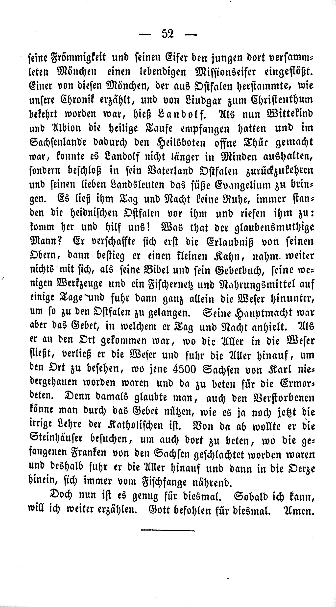 —52- His piety and his fervent desire to gather the young men of Dort one under his wing let them be filled with a living mission fervor. One of these monks, originating from Ostfalen, who had been converted to Christianity by Liudgar, was Landolf. As now Wittekind and Albion had received the holy baptism and, through the Saxony land, opened a doorway to the divine, Landolf could no longer bear the burden in Minden. He returned to his homeland, Ostfalen, and brought the sweet Gospel to his loving people. He left him no rest for a day and night, always keeping watch over the heathen pagan settlements before him, and called out to them: "Come, come and help us!" What was that man? He first obtained permission from his superiors, then climbed onto a small boat, took nothing with him except his Bible and prayer book, his few tools, and a fish, and set off alone along the Weser for several days. His main power was prayer, in which he remained day and night. When he came to the place where the greatest of the Saxons had been massacred, he left the Weser and climbed up to them. Seeing it at sight, where those 4500 Saxons had not been massacred, he went to pray for the remnants. Because then one believed that even the deceased could be comforted by prayer, as it is still the law of the Catholic doctrine. From then on, he wanted to visit the steinhauer, and therefore journeyed up to the rivers, where the Franks had been massacred, and therefore drove up to the Weser and then into the Oerze, always benefiting from fishing. But now it is enough, at this time. As soon as I can, I want to continue telling. God has ordained this once more. Amen.