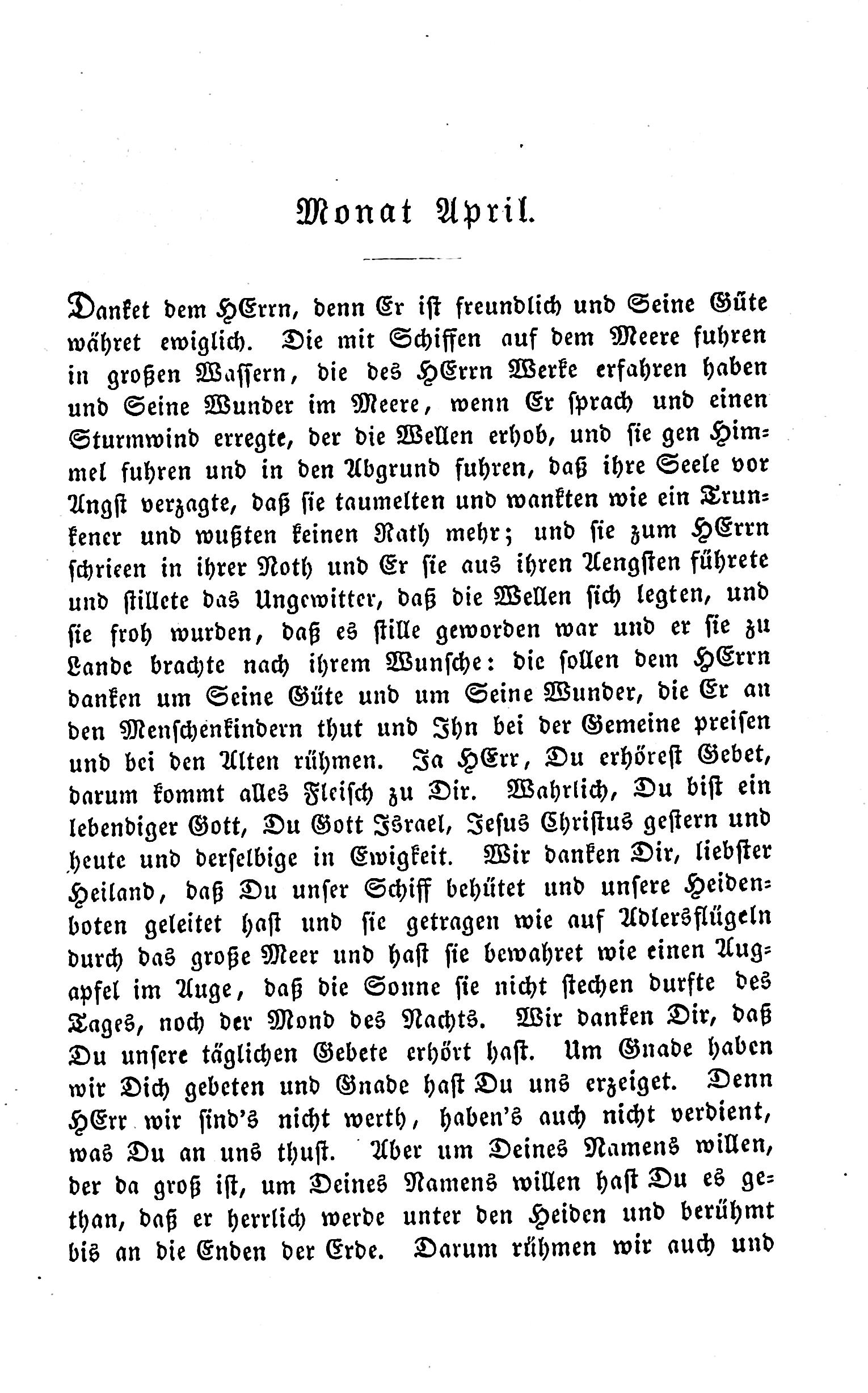 Monat April. Danket dem Herrn, denn er ist freundlich und Seine Güte währet ewiglich. Die mit Schiffen auf dem Meer fuhren in großen Wassern, die des Herrn Werke erfahren haben und Seine Wunder im Meer, wenn er sprach und einen Sturmwind erregte, der die Wellen erhob, und sie gen Him- mel fuhren und in den Abgrund fuhren, daß ihre Seele Vor Angst verzagte, daß sie taumelten und wankten wie ein Trun- kener und wußten keinen Rath mehr; und sie zum Herrn schrieen in ihrer Noth und er sie aus ihren Aengsten fährete und stillete das Ungewitter-, daß die Wellen sich legten, und sie froh wurden, daß es stille geworden war und er sie zu Lande brachte nach ihrem Wunsche: die sollen dem Herrn danken um Seine Giite und um Seine Wunder, die er an den Menschenkindern thut und Ihn bei der Gemeine preisen und bei den Alten rühmen. Ia HErr, Du erhörest Gebet, darum kommt alles Fleisch zu Dir. Wahrlich, Du bist ein lebendiger Gott, Du Gott Israel, Jesus Christus gestern und heute und derselbige in Ewigkeit. Wir danken Dir, liebster Heiland, daß du unser Schiff behieast und unsere Heiden- boten geleitet hast und sie getragen wie auf Adlersfliigeln durch das große Meer und hast sie bewahret wie einen Aug- apfel im Auge, daß die Sonne sie nicht stechen durfte des Tages, noch der Mond des Nachts. Wir danken Dir, daß du unsere täglichen Gebete erhört hast. Um Gnade haben wir Dich gebeten und Gnade hast Du uns erzeiget. Denn HErrwir sind’s nicht werth, haben’s auch nicht verdient, was Du an uns thust. ·Aber um Deines Namens willen, der da groß ist, um Deines Namens willen hast Du es ge- than, daß er herrlich werde unter den Heiden und berühmt bis an die Enden der Erde. Darum rühmen wir auch.