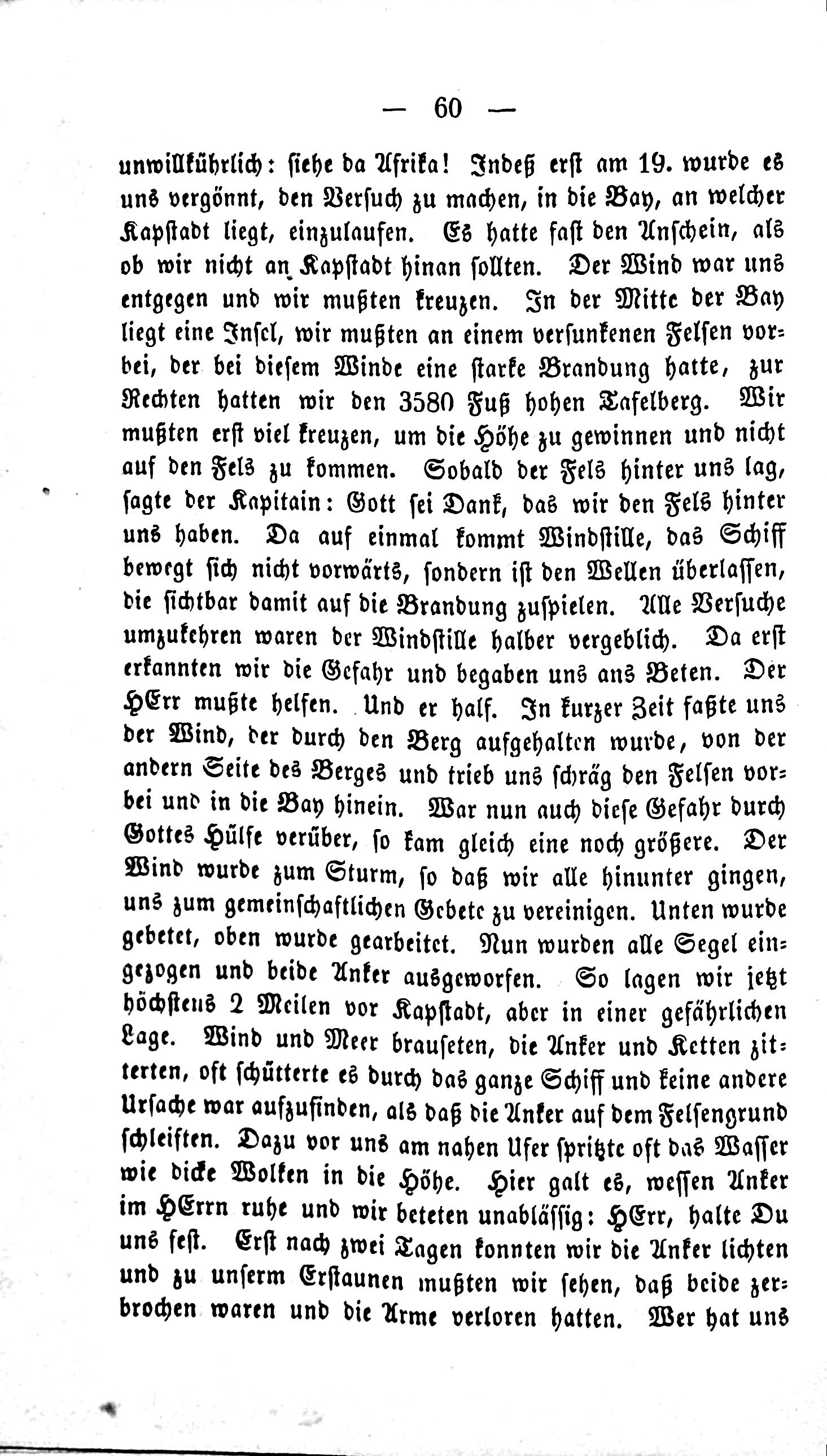—60.- Unforeseeable event: Africa appears! We were granted the first time to run into the Bay, at which point Capestadt lies. It had nearly appeared- as if we weren't going to have to descend to that point. The wind was against us, and we had to cross. In the center of the Bay, an island lies, and we must cross before a sunken islet at that wind's strong storm-. To the right, we had the height of 3580-foot Tafelbetg. We must first cross much more, to gain the height, and not on the rock. Once the rock is behind us- said the captain, God be praised, that we can cross the rock. When wind silence comes, the ship doesn't move forward, but is left by the waves. With the waves crashing on the brand – it plays for the storm-. All attempts to reverse were futile. That is when we realized the danger, and we set our prayers. The Lord must help. And He helped. In a short time, the wind seized us, halting it through the mountain, from the other side of the mountain and pushed us towards the Bay. That now also represents a greater danger through God's help, so the wind came to a storm, so we went down- UUH to the divine prayers. Below, the ship was worked. Now all the sails were attached and both anchors were dropped. So we were now perhaps 2 miles from Capestadt, thk in a dangerous position. Wind and the sea beat, the anchors and chains – often it was heavy with gusts, and no other unit stood as that. The anchors slipped on the rocky foundation, so we were there near the shore that it exploded often with water. Here it was necessary to see who our anchors were in the HEIW, and we prayed ceaselessly: Lord, hold us firm. First, after two days, we could unhook the anchors and be astonished to see that they were broken. Who has us