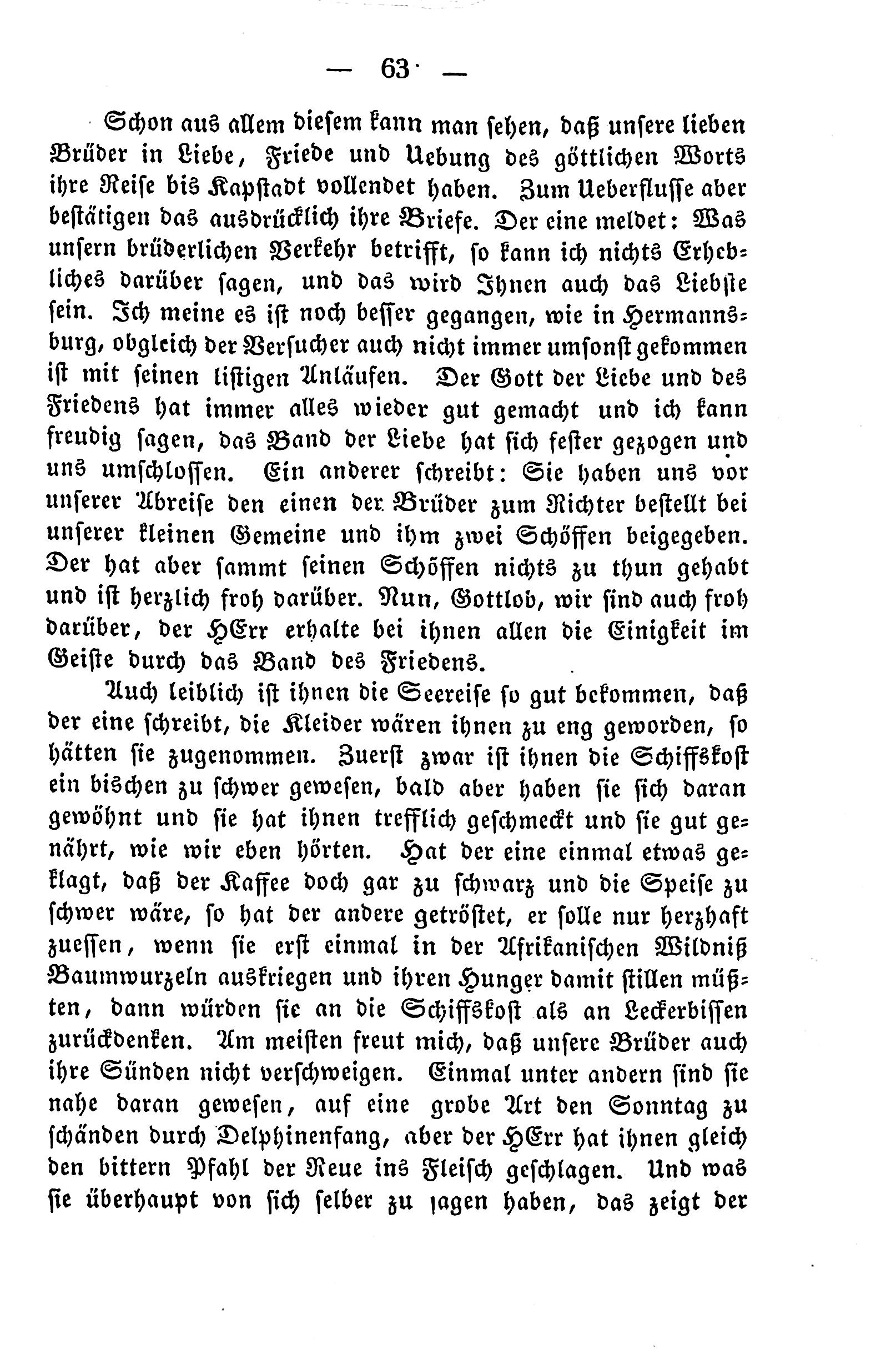 —63«— - Already from all this, one can see that our beloved brothers in love, peace, and the divine word’s fulfillment have completed their journey to Cape Town. However, it emphatically confirms their letters. One reports that nothing noteworthy can be said about their brotherly traffic, and this will be equally true for you. I am, as I think, better going, as in Hermann’s – although the procurer, even if he is not always free of cost, has come with his listless associates. The Lord of Love and Peace has always done good things, and I can happily say that the book of love has become firmly fixed and us ensconced. One writes: You have ordered to the one of the brothers, the judge, at our small gathering, and assigned them two shots. But, having delivered them to his shifters, nothing happened to him. He was relieved and happy. Now, God be with them all – may he grant them unity in spirit through the book of peace. Moreover, their sea voyage is so good that one writes, the one of the clothes would have become too tight. First, it was a little too heavy, but soon they got used to it and it pleased them well, and they hit it beautifully, as we heard. Once, one complained about the coffee being too dark and the meal being too heavy, so the other comforted him, telling him to eat only heartily if they should first exhaust their hunger in the African wild grasses and fill their hunger with it. Then, they would think of the ship’s cost as a treat, and return to it with pleasure. The most pleased with me is that our brothers have not concealed their sins. Once, they were near to causing a rough service on Sunday by capturing dolphins, but the Lord struck them down with a bitter stake. And what they have to say, that is, shows the