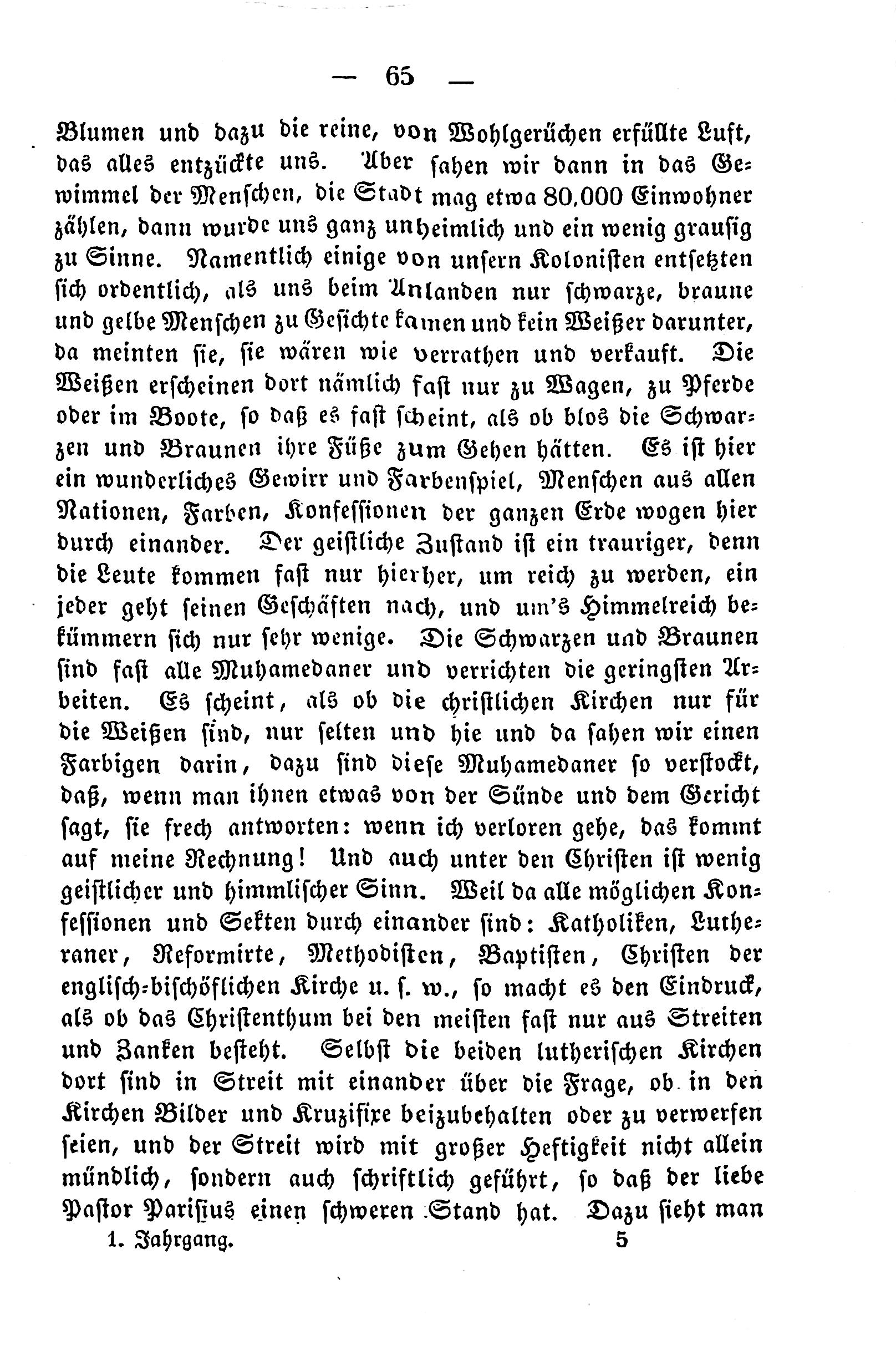 —65… » Flowers and the ones that are not. Von Wohlgeriichen erfüllte air- the whole thing was desentiickte and a little dirty. But we then saw in the ge-wimmel people—the people that we have sent. The city contains about 80,000 inhabitants, then Uns became very strange and a little brutal. Notably, some of our colonists were shocked when they arrived only black, brown, and yellow people. They saw no white person beneath them. So they thought that the white people were just to ride, ride, or in boats, so that it seems as if only the black and brown ones are walking. It is here a wonderful tangle and color play, people from all nations, colors, confessions of the whole earth are here through and through. The spiritual state is sad, because the people come mostly here to get rich, and each person goes on his business, and to care for the heavens, only few people. The black and brown people are almost all Muhamedaner and perform the least of the duties. It seems as if the Christian churches are only for the white people, rarely and here and there we saw a coloring in them; because the Muhamedaner are so warped that, if you tell them about sin and the judgment, they respond with wrath: if I die, it is my responsibility! And even among the Christians there is little spiritual and heavenly sense. Because all possible confessions and sects are mixed together: Catholics, Luthens, Reformist, Methodists, Baptists, English-Bischöfliche Church, etc. So, it seems that Christianity is mostly just about fighting and quarrels. Even the two Lutheran churches are in dispute over whether to keep images and crosses or throw them away, and the dispute is led with great weight, not just orally, but also written, so that the dear Pastor Parisus has a heavy stand. One year. 5