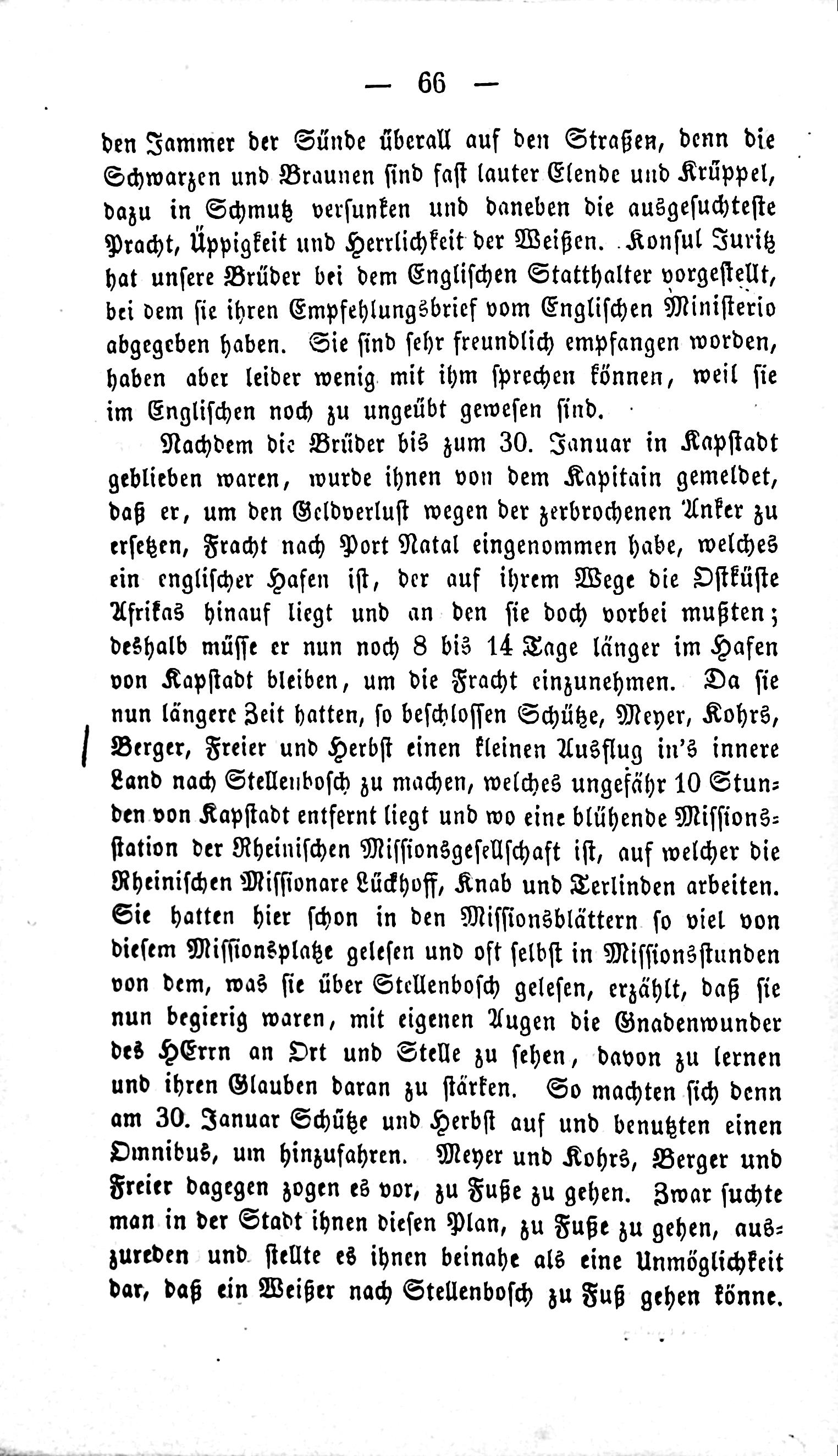 —66- the devil's racket everywhere on the streets, because the “Black and White” are almost deaf and clumsy, and among them, drowned in filth and beside the most splendid, majestic, and glorious of the Whites. ..Consul Juritz has presented our brothers to the English Governor, and they have given their recommendation letter from the English Ministry. They were received very kindly, but unfortunately could not speak with him much because they were still too unused to the English language. “After the brothers had remained in Cape Town until January 30th, the captain reported to me that he had received cargo from Port Natal, which was an English port located on the eastern coast of Africa, and through which they had to pass over the East Coast of Africa. Therefore, he must now remain for another 8 to 14 days in the Hasen of Cape Town to collect the cargo. Because they had been there for a longer time, the Schutze, Meyer, Kohrs, Berger, Freier, and Herbst decided to make a small excursion into the interior of the country to Stelle IIbosch, which is approximately 10 miles west of Cape Town and where a blossoming mission station of the Rhine Mission Society is located, where the Neissinians Lückhoff, Knab, and Terlinden are working. They had read so much about this mission place in their missions, and often told in missions hours what they had read about Stellenbosch, that they were eager to see the grace of God at the place themselves, and to learn from it. So, they made themselves go on January 30th, Schütze and Herbst leaving the bus, Meyer and Kohrs, Berger and Freier walking. They considered it impossible for a white to go to Stellenbosch on foot