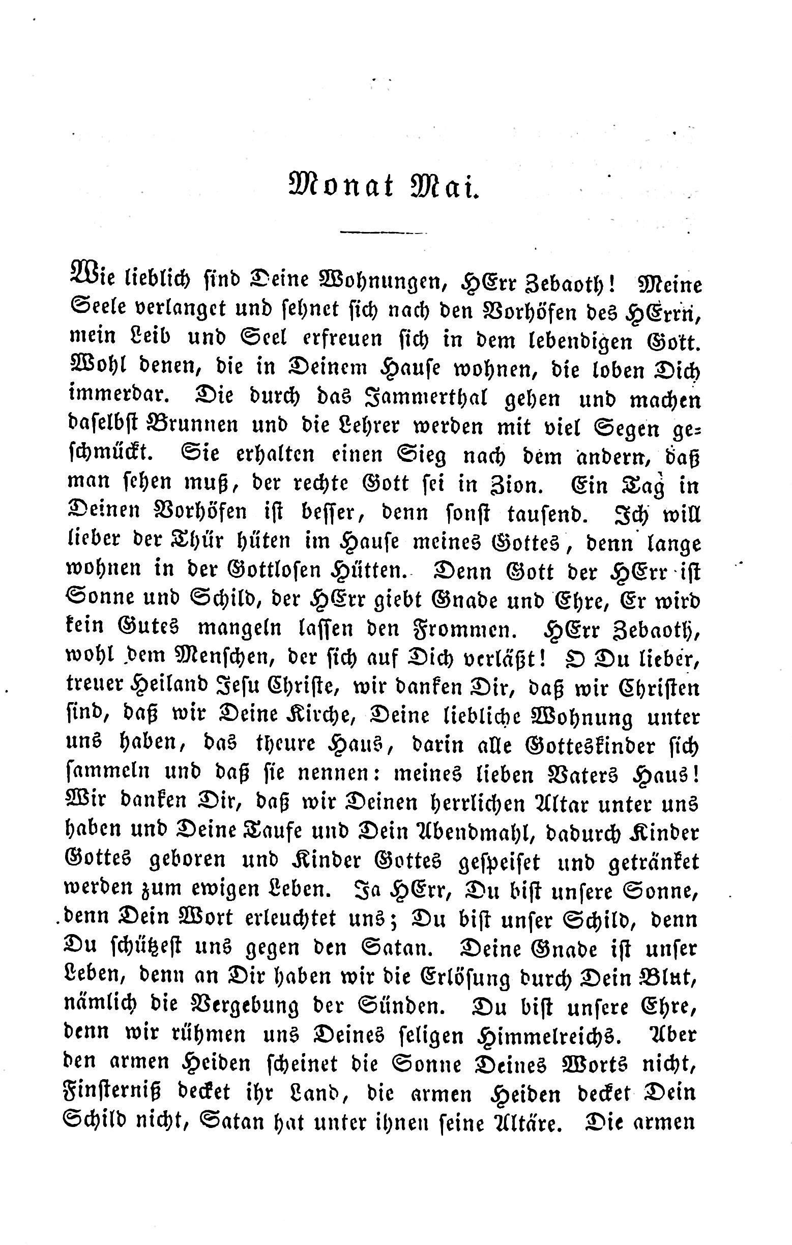 Monat Mai. Wie lieblich sind Deine Wohnungen, Herr Zebaoth! Meine Seele verlangt und sieht sich nach den Vorhöfen des Herrn. Mein Leib wünscht sich, und sehnt sich nach den Vorhöfen des Herrn, mein Leib erfreut sich in Gott. Wohl wie die, die in Deinem Hause wohnen, die loben Dich immerdar. Die durch das Jammerthal gehen und Brunnen machen, und die Lehrer werden mit viel Segen ge- schmückt. Sie erhalten einen Sieg nach dem andern, daß man sehen muss, der rechte Gott sei in Zion. Ein Tag in Deinen Vorhöfen ist besser, denn sonst tausend. Ich will lieber der Thür hüten im Hause meines Gottes, denn lange wohnen in der Gottlosen Hiitten.- Denn Gott der Herr ist in Zion. Ein Tag in Deinen Vorhöfen ist besser, denn sonst tausend. Ich will lieber der Thür hüten im Hause meines Gottes, denn lange wohnen in der Gottlosen Hiitten.- Denn Gott der Herr ist in Zion. Ein Tag in Deinen Vorhöfen ist besser, denn sonst tausend. Ich will lieber der Thür hüten im Hause meines Gottes, denn lange wohnen in der Gottlosen Hiitten.- Denn Gott der Herr ist in Zion. Ein Tag in Deinen Vorhöfen ist besser, denn sonst tausend. Ich will lieber der Thür hüten im Hause meines Gottes, denn lange wohnen in der Gottlosen Hiitten.- Denn Gott der Herr ist in Zion. Ein Tag in Deinen Vorhöfen ist besser, denn sonst tausend. HErr Zebaoth, wohl dem Menschen, der sich auf Dich verläßt! O Du lieber-, treuer Heiland Jesu Christe, wir danken Dir, daß wir Christen sind, daß wir Deine Kirche, Deine liebliche Wohnung unter uns haben, das theure Haus, darin alle Gotteskinder sich sammeln und daß sie nennen: meines lieben Vaters Haus! Wir danken Dir, daß wir Deinen herrlichen Altar unter uns haben Und Deine Taufe und Dein Abendmahl, dadurch Kinder Gottes geboren und Kinder Gottes gespeisit und getränket werden zum ewigen Leben. Ja HErr, Du hist unsere Sonne- ·denn Dein Wort erleuchtet unsz Du bist unser Schild, denn Du schiitzest uns gegen den Satan. Deine Gnade ist unser Leben, denn an Dir haben wir die Erlösung durch Dein Blut- nämlich die Vergebung der Sünden. Du bist unsere Ehre- denn wir rühmen uns Deines seligen Himmelreichs. Aber den armen Heiden scheinet die Sonne Deines Worts nicht- Finsterniß decket ihr Land, die armen Heiden decket Dein Schild nicht, Satan hat unter ihnen seine Altare. Die armen.