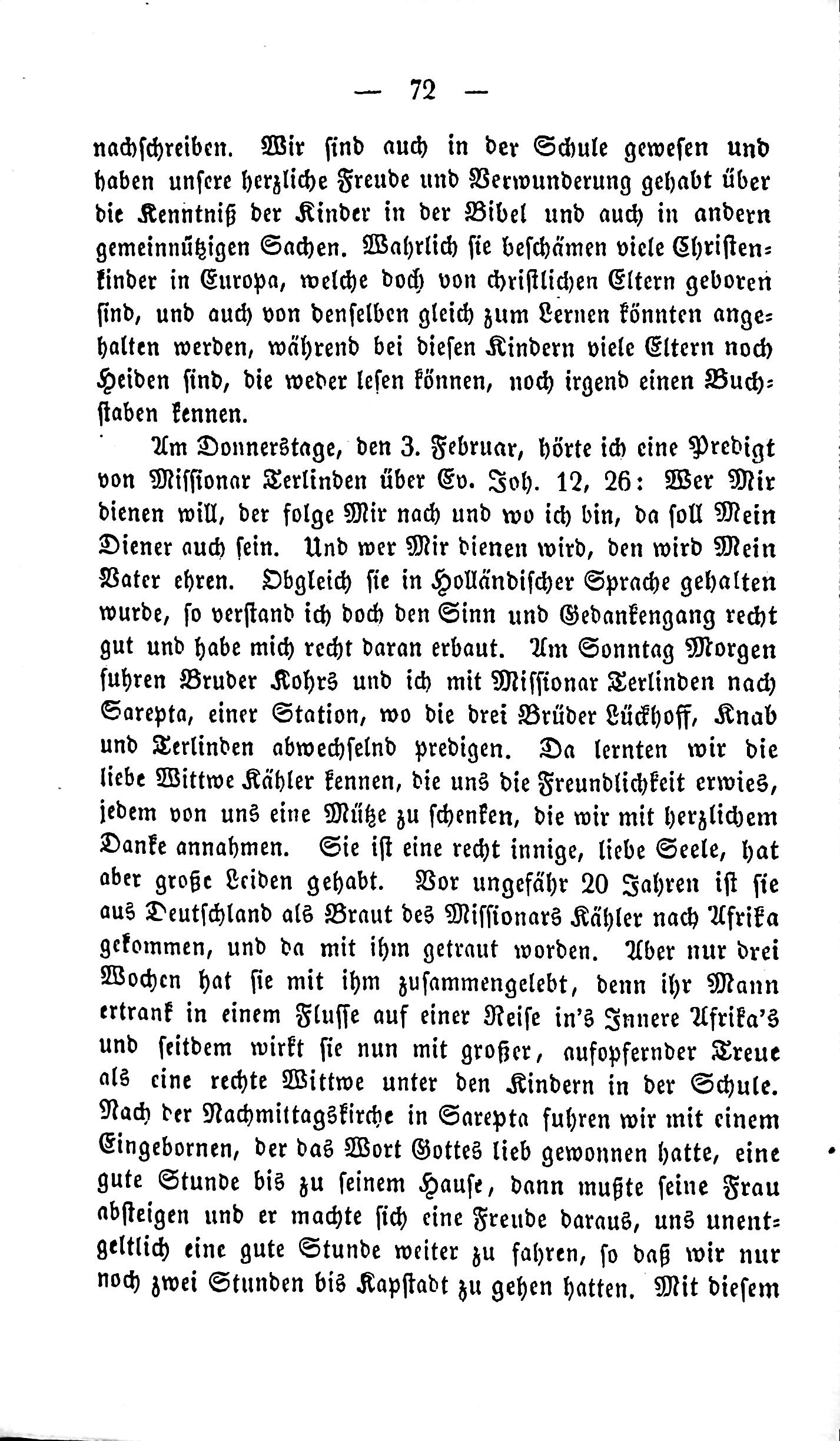 –72… nachschreiben. Wir sind auch in der Schule gewesen und haben unsere herzliche Freude und Verwunderung gehabt über die Kenntnis der Kinder in der Bibel und auch in anderen gemeinnützigen Sachen. Wahrlich sie beschämmen Viele Christen-kinder in Europa, welche doch von christlichen Eltern geboren stud, und auch Von denselben gleich zum Lernen könnten angehalten werden, während bei diesen Kindern viele Eltern noch Heiden sind, die weder lesen können, noch irgend einen Buch-staben kennen. « Am Donnerstage, den Z. Februar, hörte ich eine Predigt von Missionar Terlinden über Ev. Joh. 12 26: Wer Mir dienen will, der folge Mir nach und wo ich bin, da soll Mein Diener auch sein « Und wer Mir dienen wird, den wird Mein Vater ehren. Obgleich sie in Holländischer Sprache gehalten wurde, so verstand ich doch den Sinn und Gedankengang recht gut und habe mich recht daran erbaut. Am Sonntag Morgen suhren Bruder Kohrs und ich mit Missionar Terlinden nach Sarepta, einer Station, wo die drei Brüder Lückl)off, Knab und Terlinden abwechselnd predigen. Da lernten wir die liebe Wittwe Kähler kennen, die uns die Freundlichkeit erwies-, jedem von uns eine Mütze zu schenken, die wir mit herzlichem Danke annahmen. Sie ist eine recht innige, liebe Seele, hat aber große Leiden gehabt. Vor ungefähr 20 Jahren ist sie aus Deutschland als Braut des Missionars Kähler nach Afrika gekommen, und da mit ihm getraut worden. Aber nur drei Wochen hat sie mit ihm zusammengelebt, denn ihr Mann ertrank in einem Flusse auf einer Reise in’H Innere Afrika’s und seitdem wirkt sie nun mit großer, aufopfernder Treue als eine rechte Wittwe unter den Kindern in der Schule. Nach der Nachmittagskirche in Sarepta fuhren wir mit einem Eingebornen, der das Wort Gottes lieb gewonnen hatte, eine gute Stunde bis zu seinem Hause, dann mußte seine Frau absteigen und er machte sich eine Freude daraus-, uns unent- geltlich eine gute Stunde weiter zu fahren, so daß wir nur noch zwei Stunden bis Kapstadt zu gehen hatten. Mit diesem