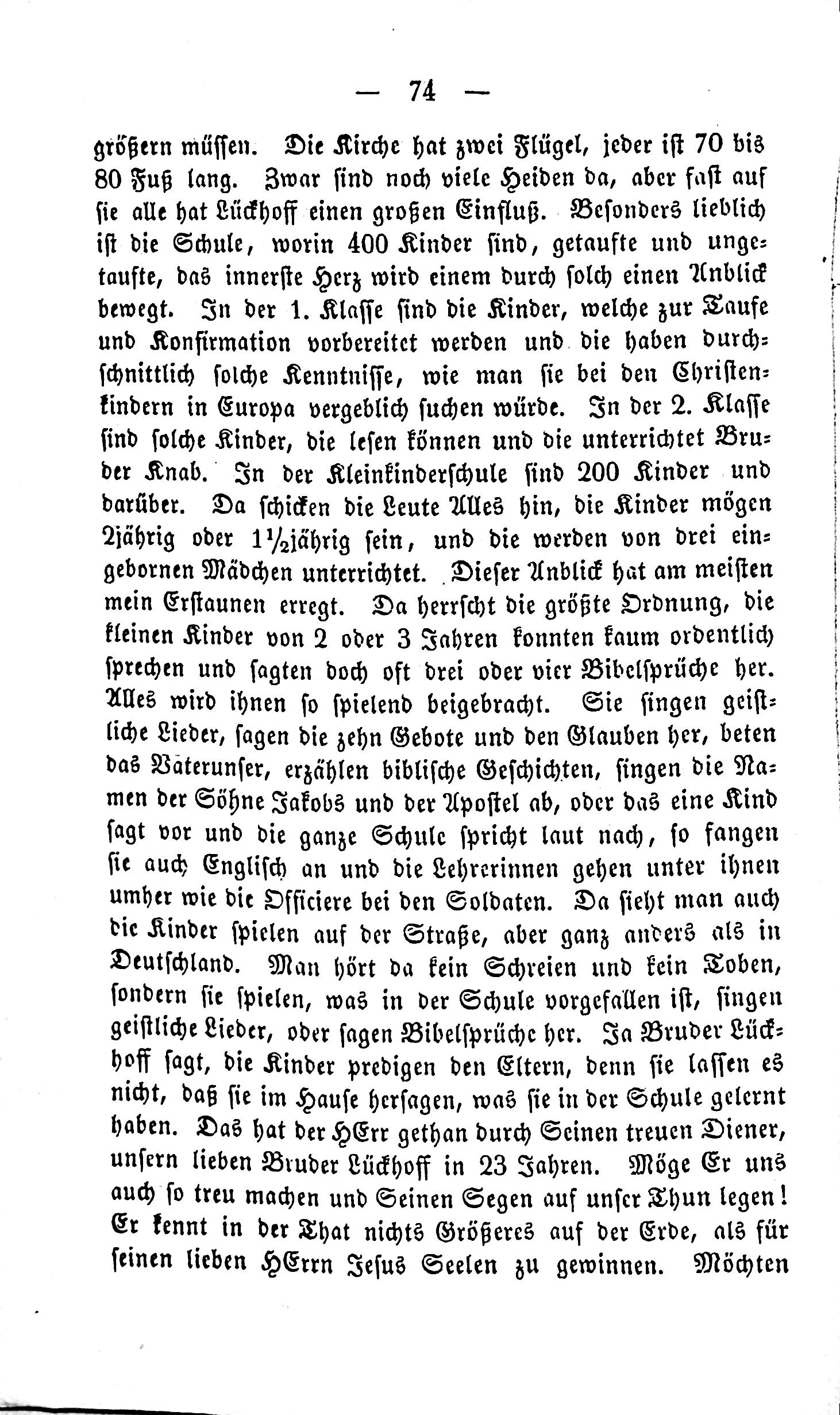 -74— the extent must be considered. The church has two wings, each 70 to 80 feet long. Although many heretics remain, Liickhoff has almost all influence on them. The school, in which there are 400 children, baptized and unbaptized, is a sight that moves one so much. In the 1st grade, the children who are prepared for baptism and confirmation have through- schnitted such knowledge that one cannot find such knowledge in Europe among the Christians. In the 2nd grade, such children who can read and are taught the basics of language are a cause of most astonishment. In the 1st grade, the children who are preparing to be baptized and confirmed, the children are very surprised. In the 2nd class, such children who can read and are taught the basics of language are the children that cannot speak, and who often say three or four biblical sayings. All is taught playfully. The children sing spiritual songs, say the ten commandments, and believe them – pray the VHUWUTSH. They sing the sons of Jacob and the Apostle, or one child speaks, and the whole school speaks out loud, so they begin to teach English and the teachers go around like the officiers of soldiers. One sees the children playing from the streets, but altogether different from Germany. One hears no screams and no laughing – they play, not what is happening in the school, singing psalms, reciting the scriptures, singing prayers, and reciting biblical stories. Brother Lückhoff says, that the children preach to the parents, because they do not allow them to speak in the house, which is not that they speak in the house. This has been done by his faithful servant, our dear Brother Lückhoff in 23 years. May He grant us also much benefit and His blessing upon our town. He knows nothing greater on earth than for his own salvation, souls to win.