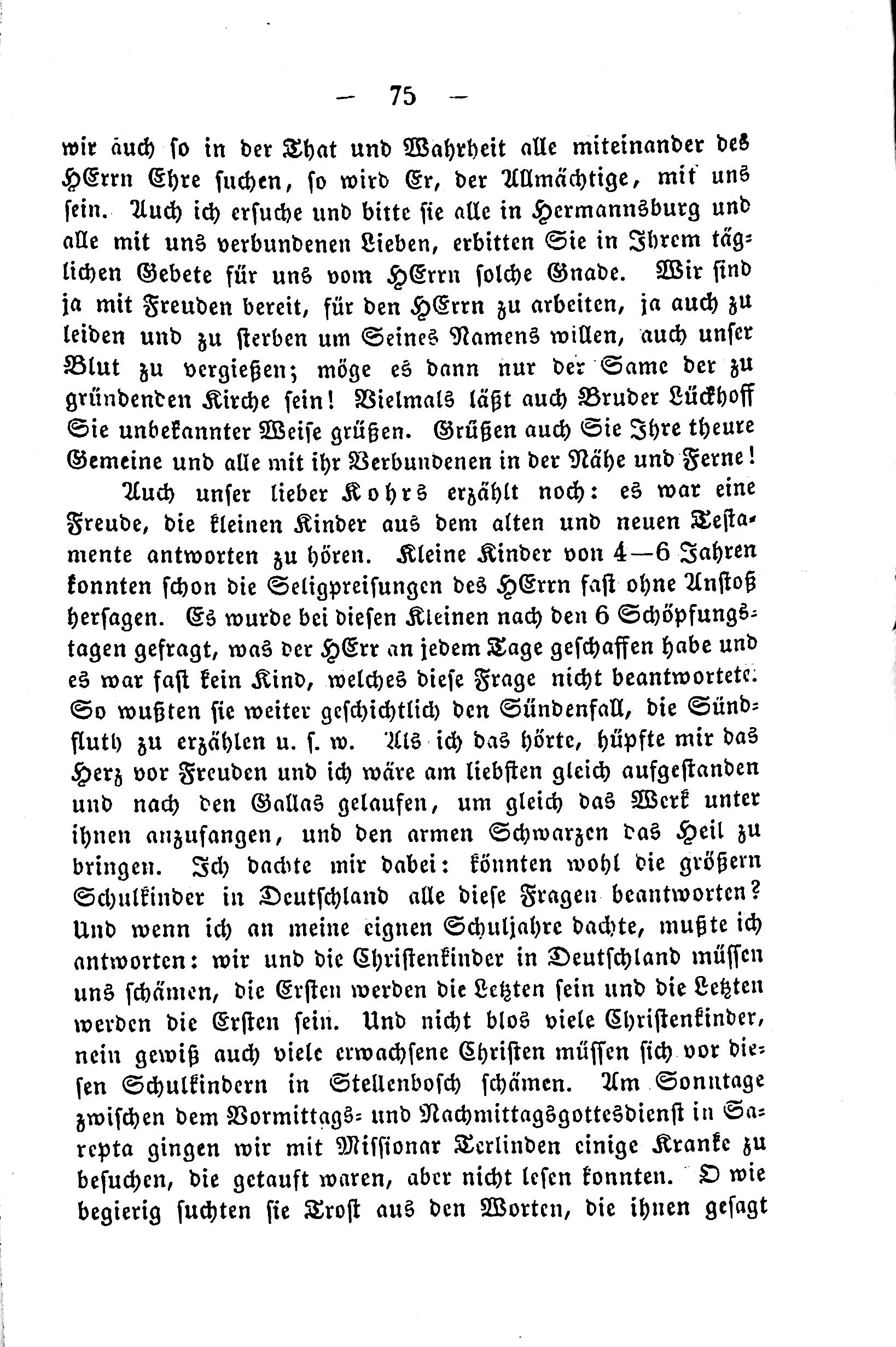 Translate from German to Chinese: –75- We also seek together with all of us the truth and truth of the world. The HEMI honor is sought by us, the All-Powerful one, and will be with us. We also implore and request all of you in Hermannsburg and all connected to us, may you receive blessings in your daily prayers for us from the Herr, the All-Powerful one. We are, by our own free will, willing to work for the Herr, to suffer and to die (die – death – in this context refers to dying) to will of his name, and to burn his blood. May it then only be the-same of the divine church. Many often bless Brother Lückhoff. Greetings also to you, dear brother. Also, brother Lückhoff, you are known for your strange greeting. Greetings also to you and your fellows near and far! Also, our dear Kohrs tells us: it was a joy that the little children from the old and new Testa- mente answered questions. Little children, aged four to six years, could almost ask for any blessing the Herr has given at each day. When these children were asked what the Herr had created at each day, it was almost no child who didn’t answer this question. So, they learned further that the Sinful story, the Sünden to tell, etc. Did you hear, my heart was filled with joy, and I would gladly have risen up and run alongside them, to start the work on them! The poor black people were also to be healed. I thought: Could the largest children in Germany all answer these questions? And if I thought of my own school years, I must say: we and the Christian children in Germany must be ashamed, the first ones are the last, and the last ones are the first. And not only many Christians, but many grown Christians must be ashamed before the children in Stellenbosch. At the “Sunday between Morning and Afternoon Service in Sarpera,” we went with Missionar Terlinden a group of sick people who were baptized but not could read. “O, how eager were they seeking comfort from the words they heard.”