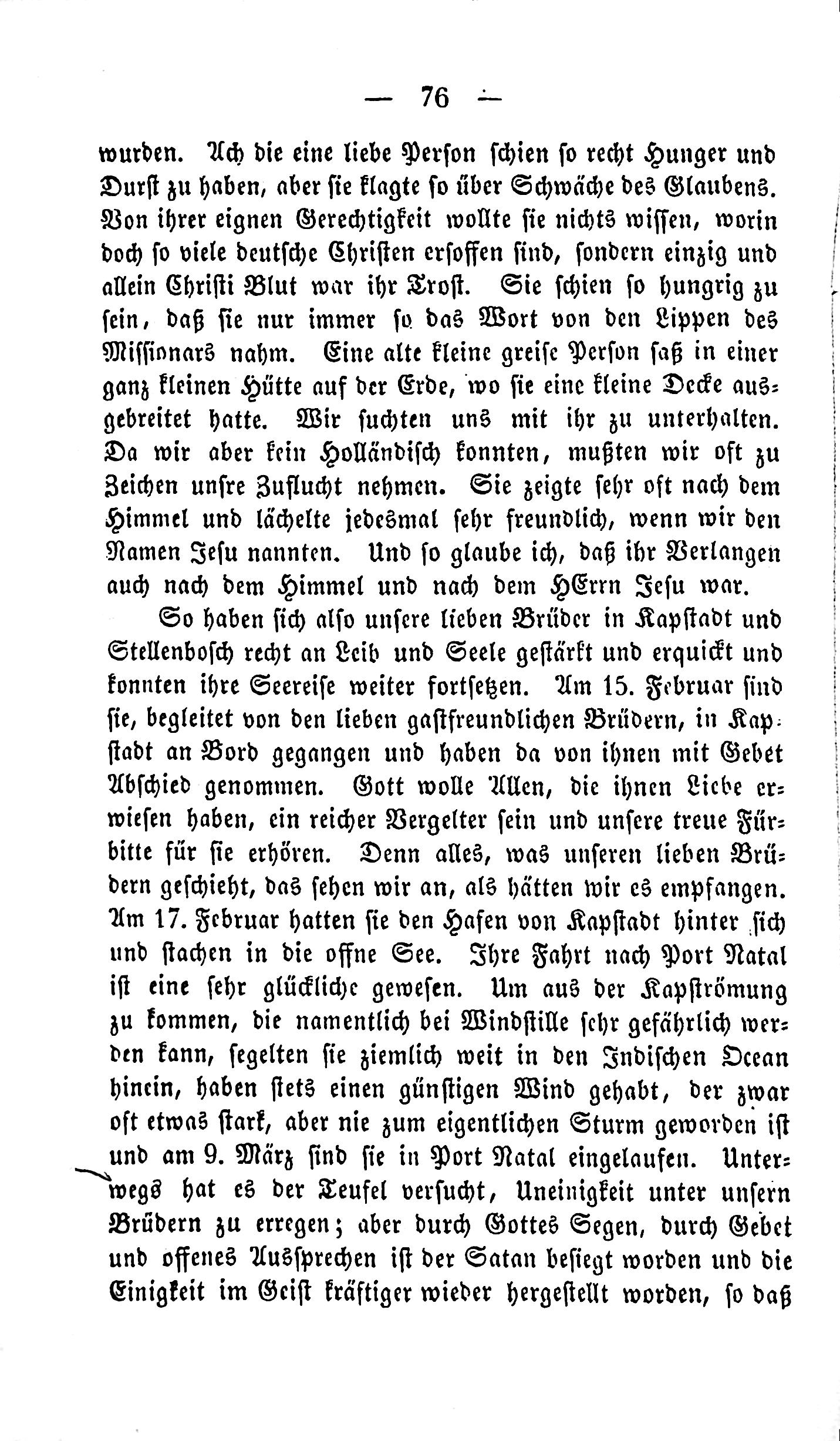 Wurde. The one beloved person seemed quite hungry and thirsty, but she complained so much about the weakness of faith. She desired nothing more than to know her own justice, but she did not want to know what so many German Christians had suffered, but only Christ's blood was her comfort. She seems so hungry that she always took the word from the missionary's lips. An old small old woman sat in a very small hut on the earth, where she had woven a small blanket. We sought to speak with her. But since we couldn't understand Dutch, we often had to take refuge. She often looked to the sky and smiled every time very kindly when we called on Jer. And so I believe that her desire also extends to the sky and to the Lord Jesus. Thus, we have strengthened our dear brothers in Cape Town and Stellenbosch, restraining and restraining them, and they can continue their sea voyage further. On. February, they set sail with the loving guest brothers in Cape Town, and departed from them with prayer for blessings. God may grant to those who have given love, be a generous and faithful protector, and to please our loyal friendship. For everything that happens to our dear brothers, we see it as if we have received it. On the 17th February, they left the harbor of Cape Town behind and set sail into the open sea. Their journey to Port Natal was very fortunate. To come from Cape Town, especially at Windstille, is very dangerous. They sailed quite far into the Indian Ocean, always having a favorable wind that, though often quite strong, never became a real storm. Now on the 9th March, they arrived in Port Natal. During their travel, the devil tried to create discord among our brothers, but by God’s blessing, through prayer and open discussion, the Satan was defeated and the unity of spirit strengthened again, so that…
