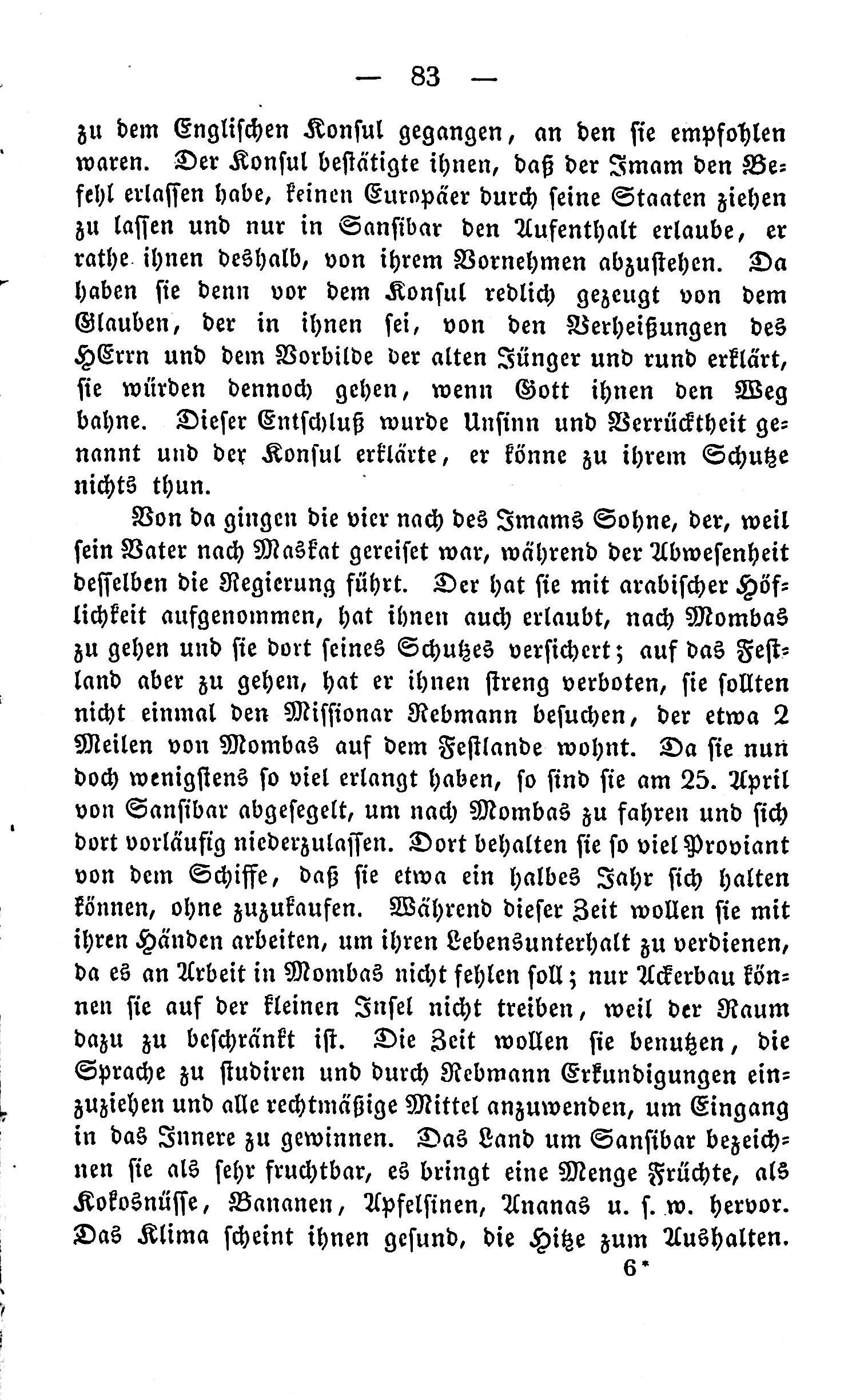 Translation: To the English Consul, an whom they were recommended, went the four, to be dismissed. The Consul confirmed that the Imam had absconded, that no European could pass through his states, and only in Sansibar allowed stay, and therefore, therefore, they would be deducted. There, they had established a fair claim based on the belief that it were in them, that the Lord and your example of the old Jänger would be fulfilled, and they would still go if God granted them a path. This decree was deemed absurd and vexation, and the Consul declared that he could not do anything. From that, the four sailed to the Imam’s son, who, since his father had traveled to Maskat while his absence was the government’s undertaking. He had received them with Arabic etiquette, allowing them to go to Mombas and be assured of his protection there, but also to go to the lands of the island, they were strictly forbidden to even visit the Missionar Rebmann, who lived approximately 2 miles from Mombas on the island. Now, they had gained so much, so they sailed from Sansibar on April 25th, to go to Mombas and establish themselves temporarily there. They retained so much supplies from your ship that they could remain for about half a year without buying. During this time, they would work with their hands to earn a living, because there must be work in Mombas. They would not drive the land to cultivate crops, because the space is limited. The time they will use to study the language and receive information from Rebmann, and apply legal means to obtain entrance. The land designated them as very fertile, brings a lot of fruits, such as coconuts, bananas, apples, and pineapples. The climate seems healthy, and the heat must be tolerated. 6I