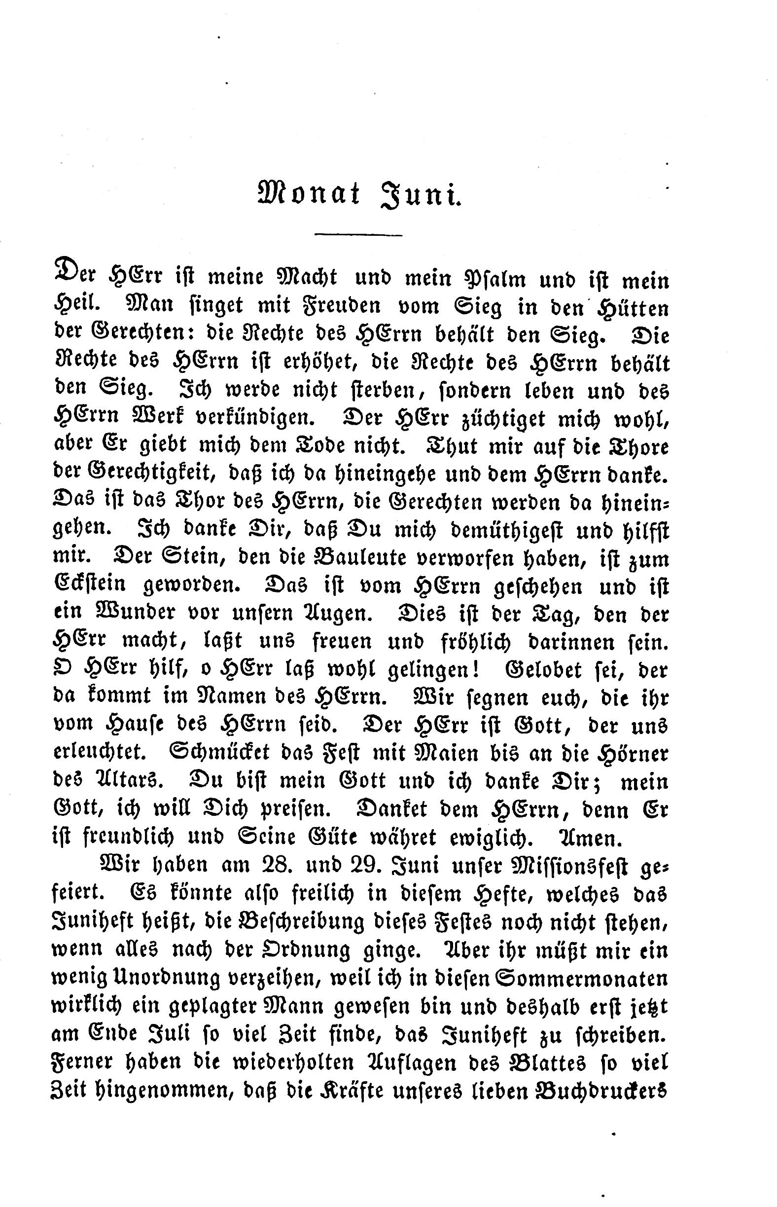Monat Juni. Der Herr ist meine Macht und mein Psalm und ist mein Heil. Man singt mit Freuden vom Sieg in den Höhlen der Gerechten: die Rechte des Herrn behält der Sieg. Ich werde nicht sterben, sondern leben und des Herrn Werk verkündigen. Der Herr züchtigt mich wohl, aber er gibt mir dem Tod nicht. Tue mir auf die Thore der Gerechtigkeit, dass ich da hineingehe und dem Herrn danke. Das ist das Thor der Gerechten, die da hinein gehen. Ich danke Dir, dass Du mich mündig und hilfst. Der Stein, den die Bauleute verworfen haben, ist zum Eckstein geworden. Das ist vom Herrn geschehen und ist ein Wunder vor unserem Augen. Dies ist der Tag, den der Herr macht, laßt uns freuen und fröhlich darinnen sein. O Herr, hilf, o Herr, laße wohl gelingen! Gelobet sei, der da kommt im Namen des Herrn. Wir segnen euch, die ihr vom Hause des Herrn seid. Der Herr ist Gott, der uns erleuchtet. Mach das Fest mit Maien bis an die Hörner des Altars. Du bist mein Gott und ich danke Dir; mein Gott, ich will Dich preisen. Danket dem Herrn, denn Er ist freundlich und Seine Güte währet ewiglich. Amen. Wir haben am 28. und 29. Juni unser Missionsfest ge- feiert. Es könnte also in diesem Hefte, welches das Juniheft heißt, die Beschreibung dieses Festes noch nicht stehen, wenn alles nach der Ordnung ginge. Aber du musst mir ein wenig Unordnung verzeihen, weil ich in diesen Sommermonaten wirklich ein geplagter Mann gewesen bin und deshalb erst jetzt am Ende Juli so Viel Zeit finde, das Juniheft zu schreiben. Ferner haben die wiederholten Auflagen des Blattes so Viel Zeit hingenommen, daß die Kräfte unseres lieben Buchdruckers…