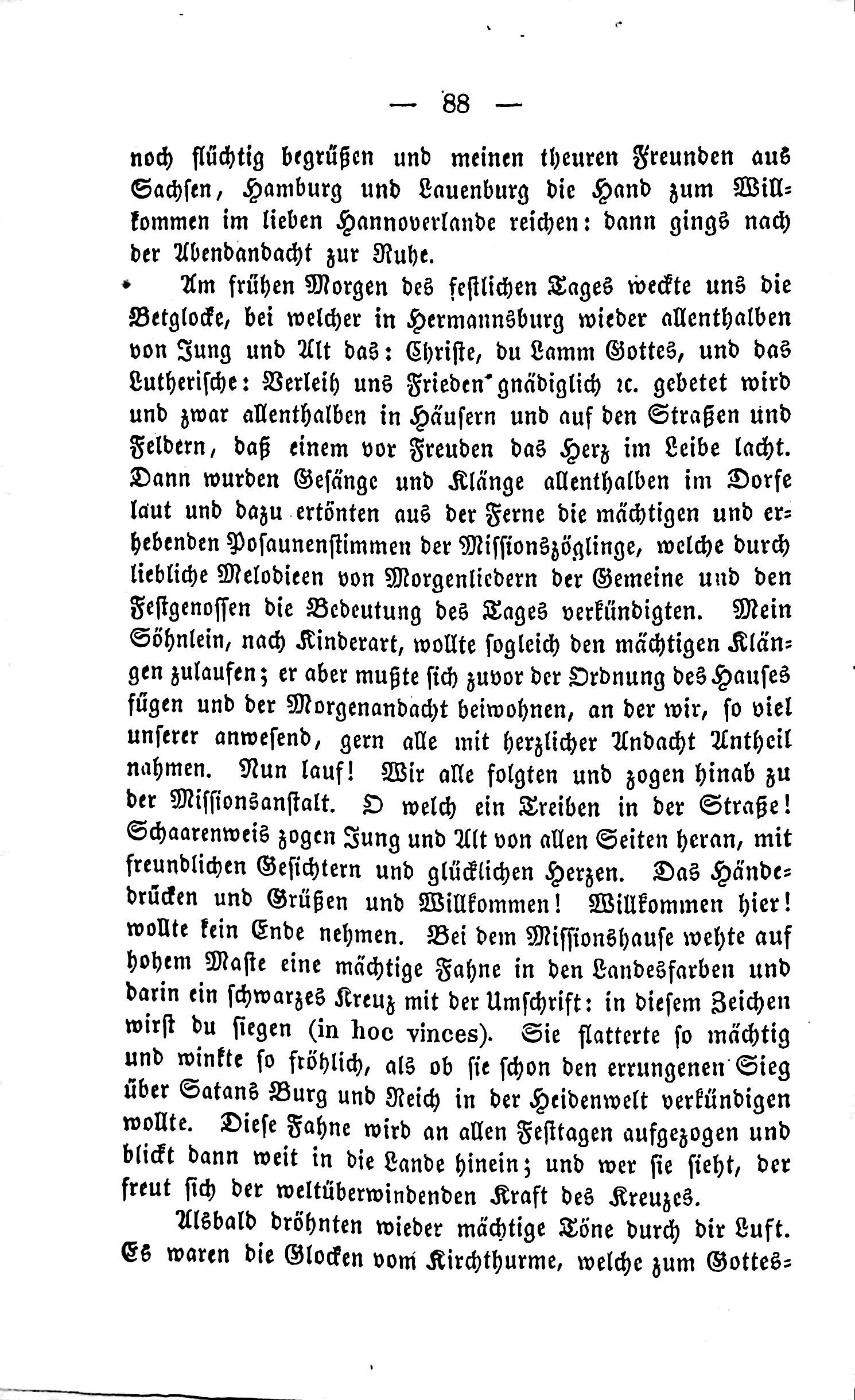 Here is the translation of the text: noch fleetingly greet you and my friends in Saxony, Hamburg, and Lower Saxony, and bid farewell to them in the loving Hanoverland: then we go to the evening prayer and, in Hermannsburg, all around, Jung and Alt are all welcome: Christ, you Lamb of God, and the Lutherian: grant us peace. I pray that my fate will be all welcome in houses and on the streets and fields, that before joy, it laughs in the heart. Then songs and sounds all around in the village come out, and the mighty and elevating pipe organ of the missionary youths, which through lovely melodies, of morning light, of the common and the festive, convey the meaning of the day. My hope is that after my birth, I would soon obey the powerful emblems, but had to first comply with the order of the house and attend the morning prayer. We, all of us present, gladly offer our hearts with heartfelt attendance. Now listen! We all followed and went down to the mission institute. How lively a scene in the street! Chessmen, Jung and Alt, all around, with friendly faces and happy hearts. Greetings and farewell! It will not end! At the mission house, a powerful banner in the Landesfarben blew on the mast, and there was a black cross with the inscription: in this sign, you will conquer (win) Satan's power and dominion. It fluttered so powerfully. And, as if it were already announcing the victory over Satan's power and dominion in the Heidenwelt, King's these banners are painted. It will be painted on all festive days and then look far into the lands, and who sees it, is the power of the cross of the world. Soon, mighty sounds came through the air. It was the bells of the church, which to God…