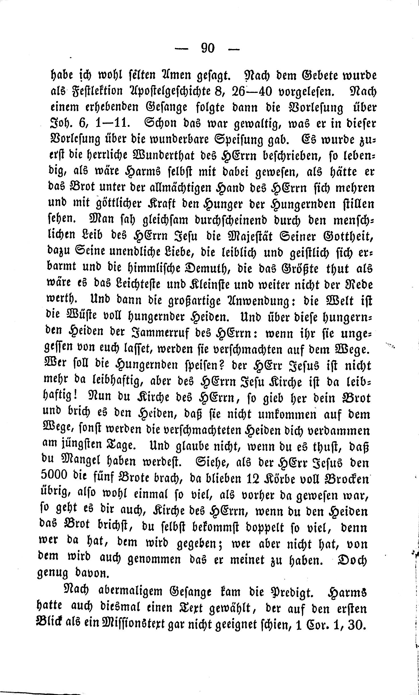 —90.- I clearly stated Amen often. After the prayer, he read a parable from the Book of Acts, chapter 8, verses 26-40. Following a rousing sermon, he then recounted the Borlcsung, which began with John 6, verse 1-11. It was remarkably intense, and he described in this Borlcsung the wonderful provision of the Lord. It was first the glorious miracle of the Lord described, so that he lived, as he was, the very Harms themselves with God's power to multiply bread and to quench the hunger of the hungry. It was then that the human flesh of the Lord appeared clearly, so that he showed the bread, under the Lord’s mighty hand, to be multiplied and to give divine power to quench the hunger of the hungry. It seemed, at that moment, that through the human flesh of the Lord Jesus, we could see the Lord’s majesty. He gave His infinite love, both spiritually and materially, and to the heavenly mercy which does the greatest of deeds as if it were the easiest and smallest. And then the great application: the world is a wasteland full of hunger-stricken Heiden. And about this hunger of the Heiden, the Harms of the Lord: if you let them wander without, they will be smitten on the way. Who shall feed the hungry? Jesus is not more there, but the Church is there! Now, Church of the Lord, let your bread come forth and break it, so that they do not die on the way. Do not believe that you will have enough; when Jesus broke the loaves of bread, twelve bowls, there remained 12 baskets full of bread, so, perhaps, once before, it is true, Church of the Lord, if you break the bread, you receive twice as much, for it is given to me; whoever does not have, is also taken by others. But enough of it- After a further song came the preaching. Harm’s had also chosen this text, which seemed not suitable at first glance as a missionary text, 1 Cor. 1, 30.